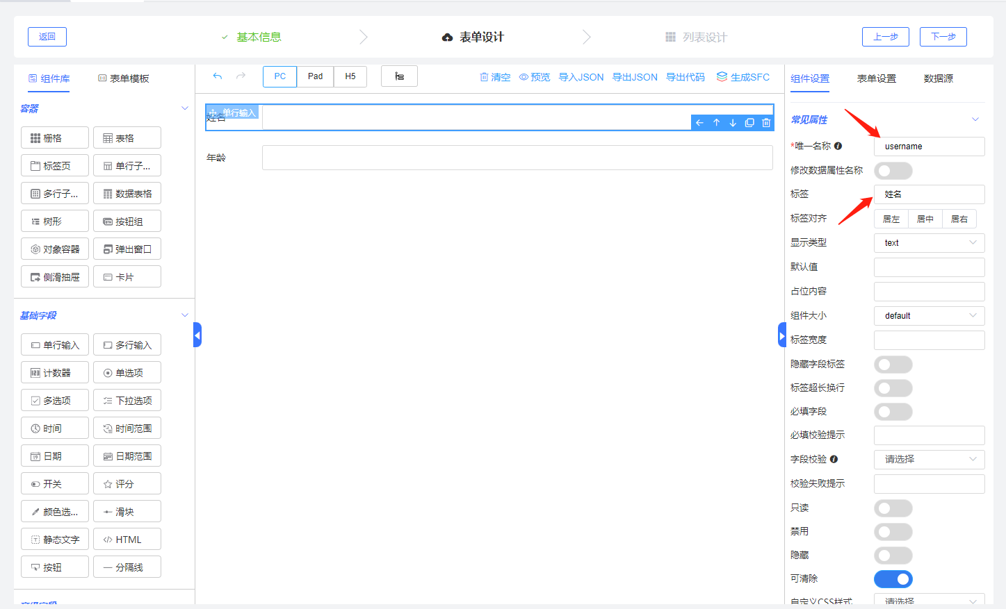 先拖拽出对应表单项,在配置其属性,如(唯一名称:数据键名;标签:显示名称)等。