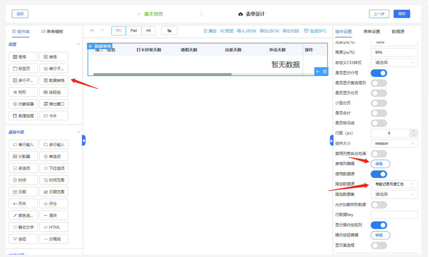 先拖拽出数据表格,再配置表格列及绑定数据实现自定义查询表单。