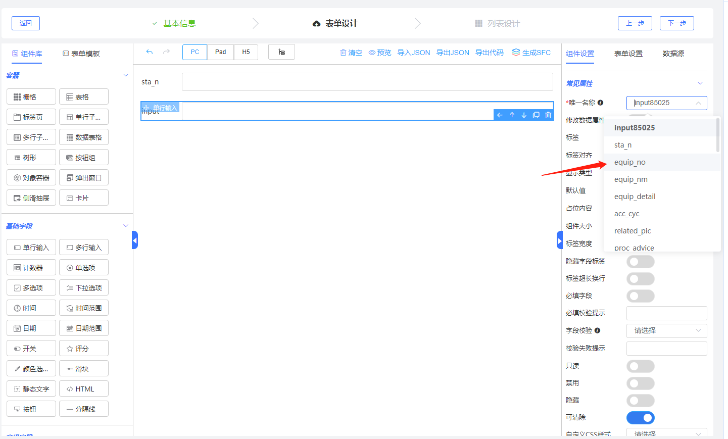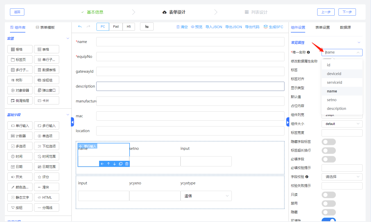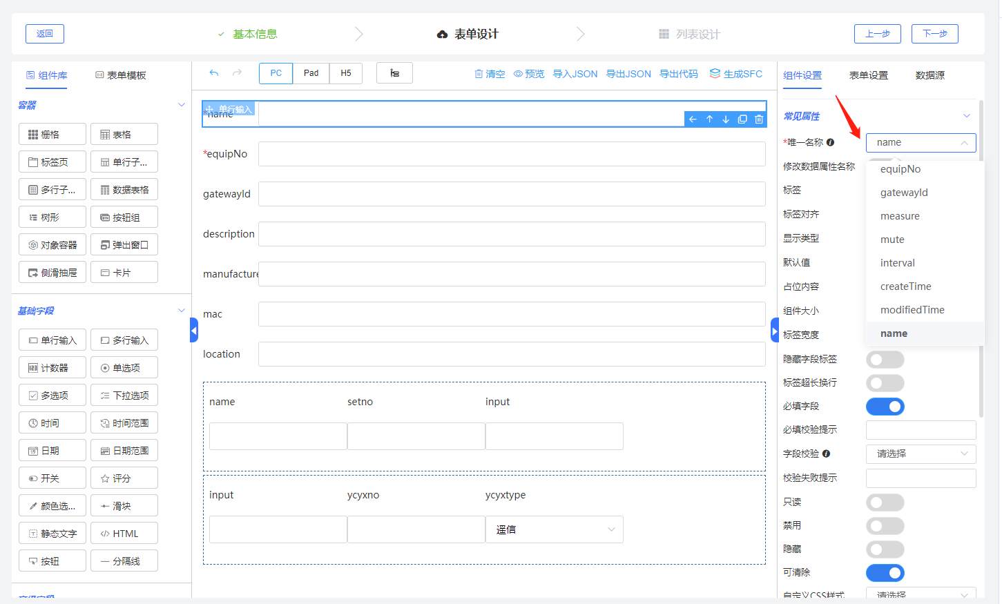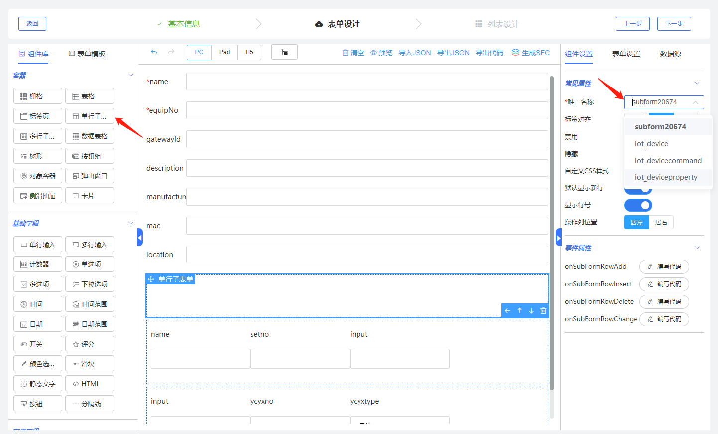 绑定数据表后,拖拽表单项到子表单中,唯一名称属性下拉项为所绑定数据表的字段。