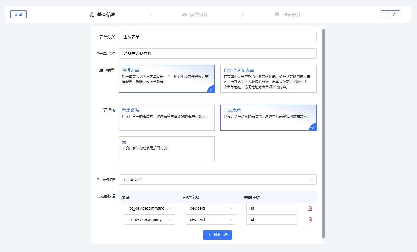 选择主表及从表,从表可以配置多个数据表,外键字段选择数据表的主键。