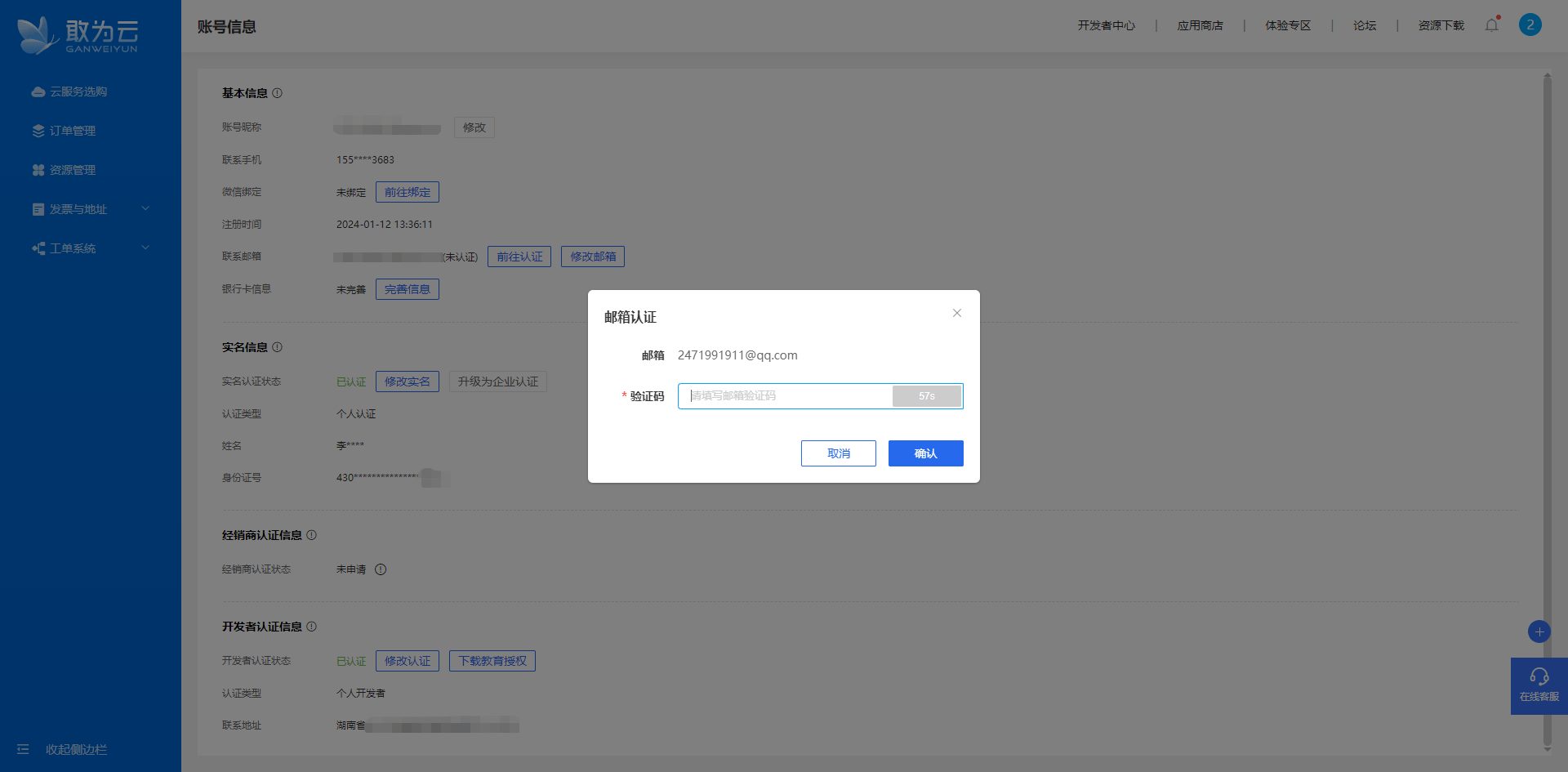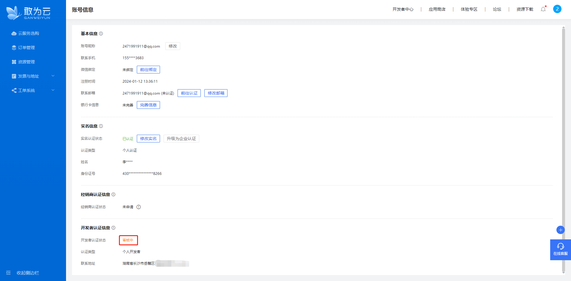 - 返回账号信息界面个人开发认证状态变为审核中。