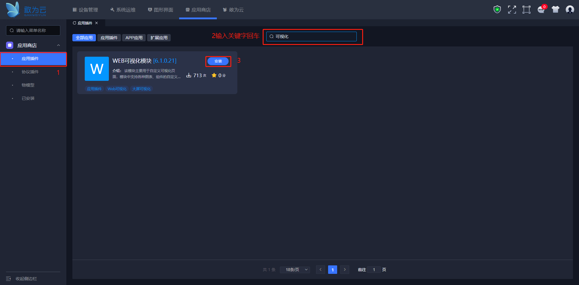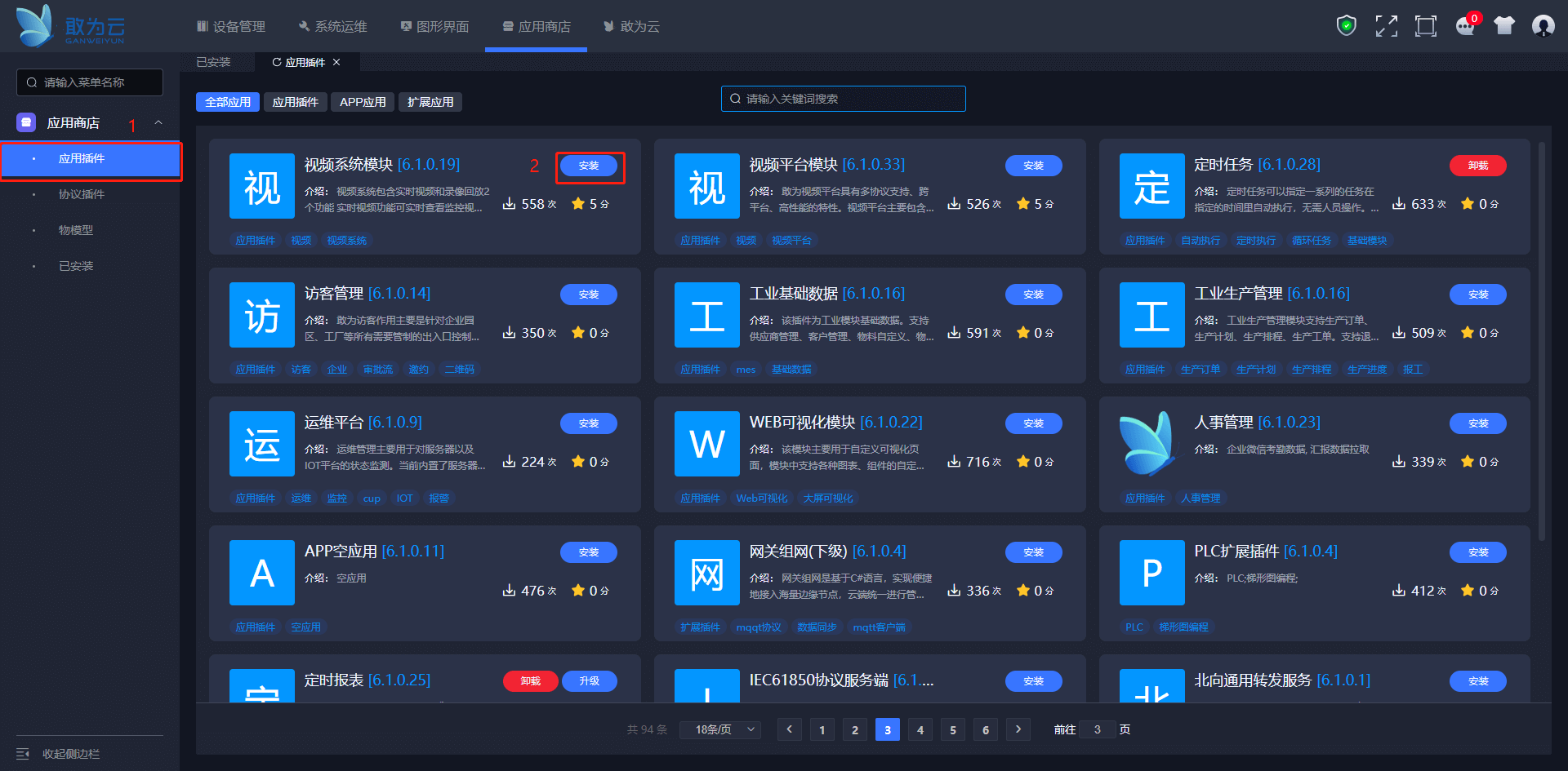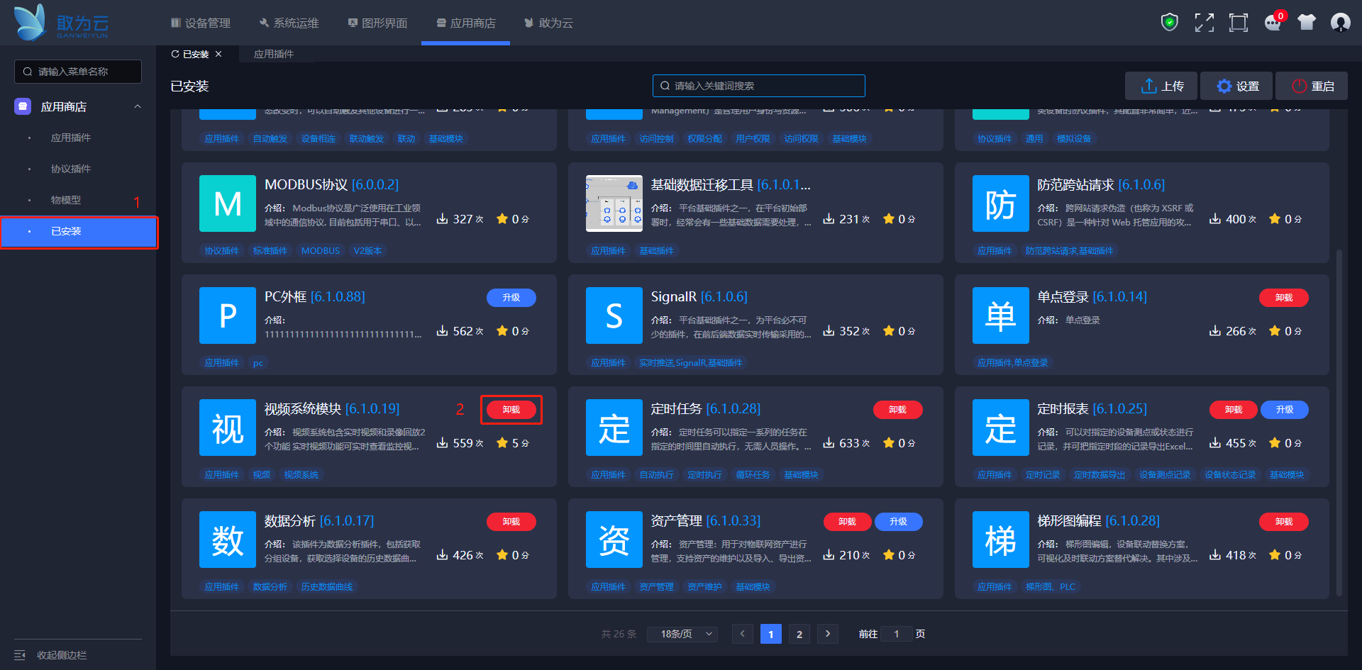 - 点击页面中的插件对应的卸载按钮,可将该插件从平台中卸载、并删除该菜单和相关文件。