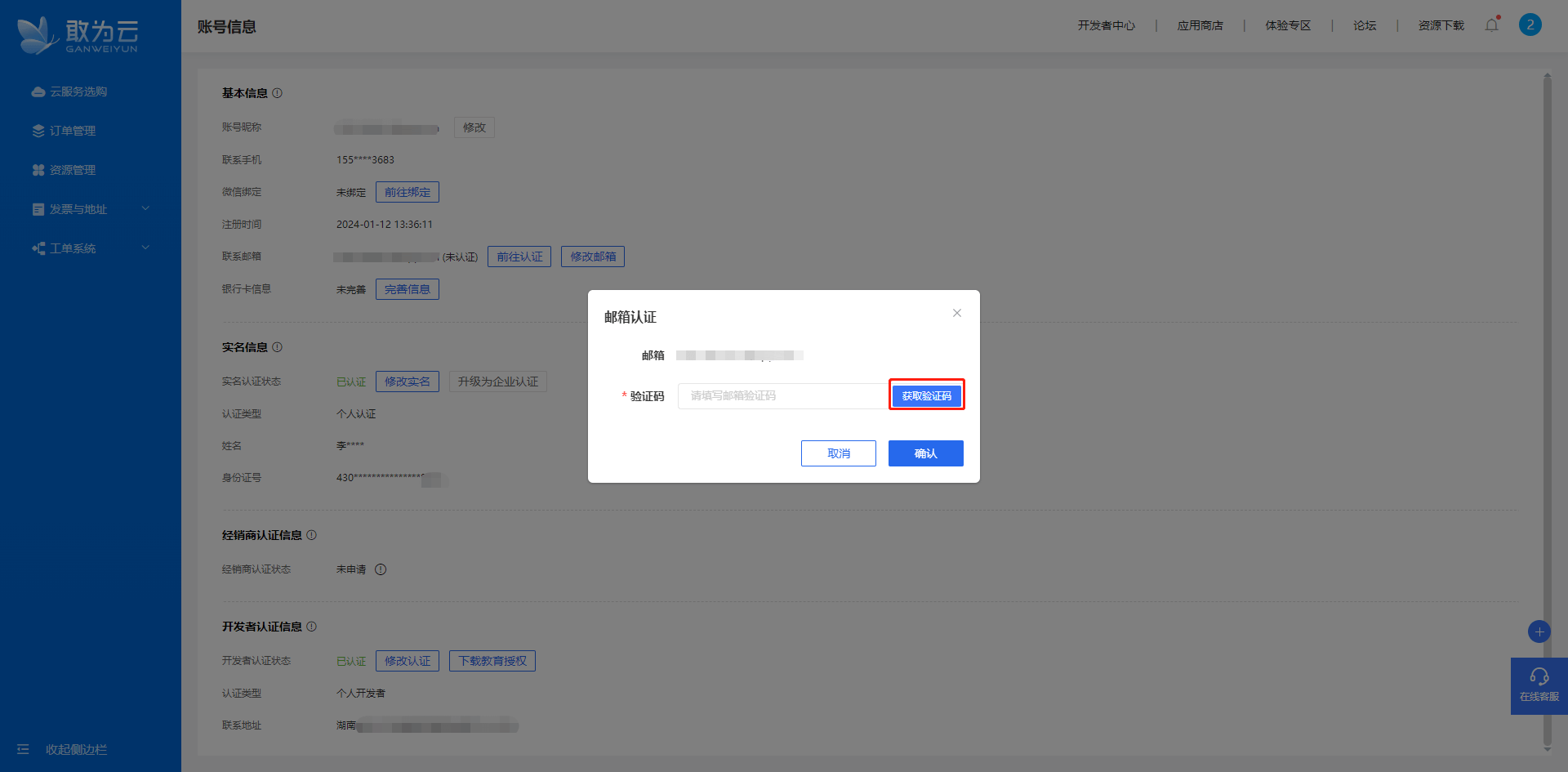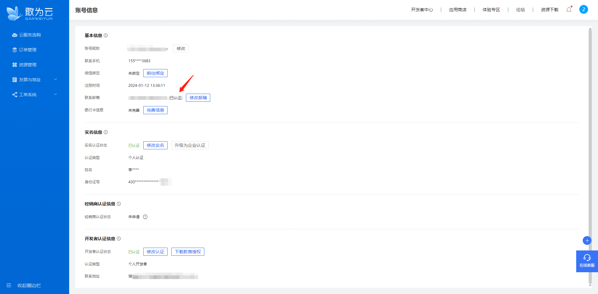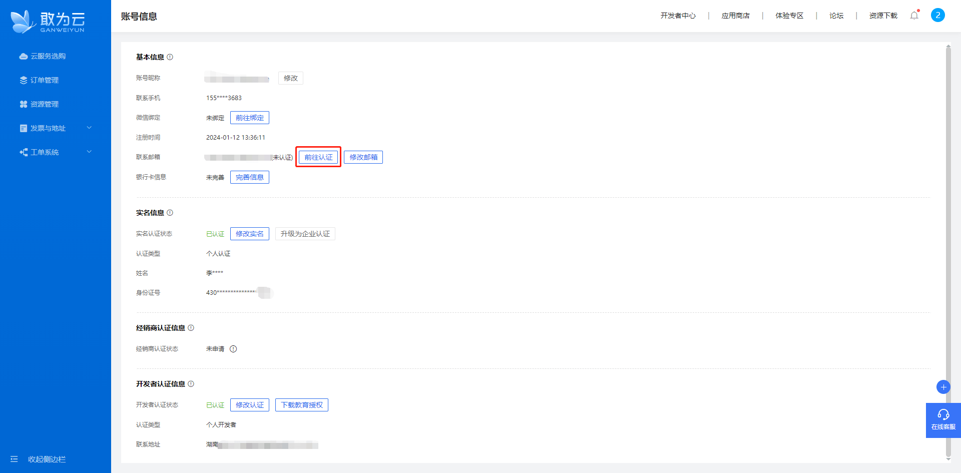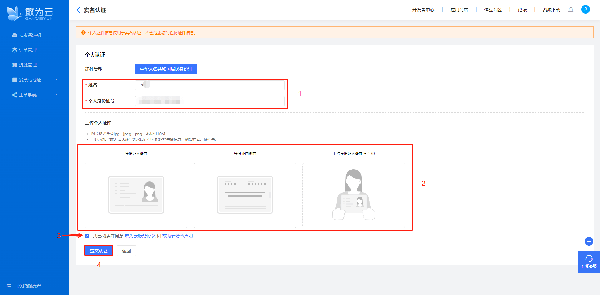 - 输入真实姓名、身份证号、上传身份证照片等,点击提交认证。