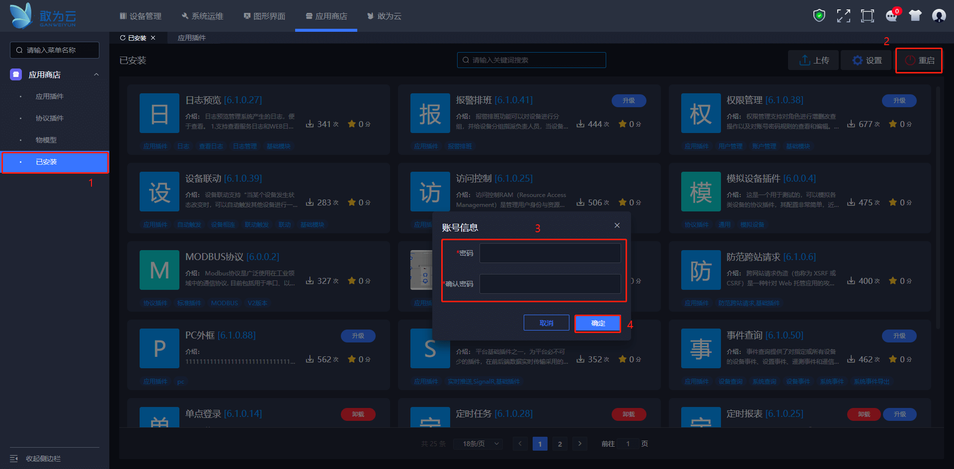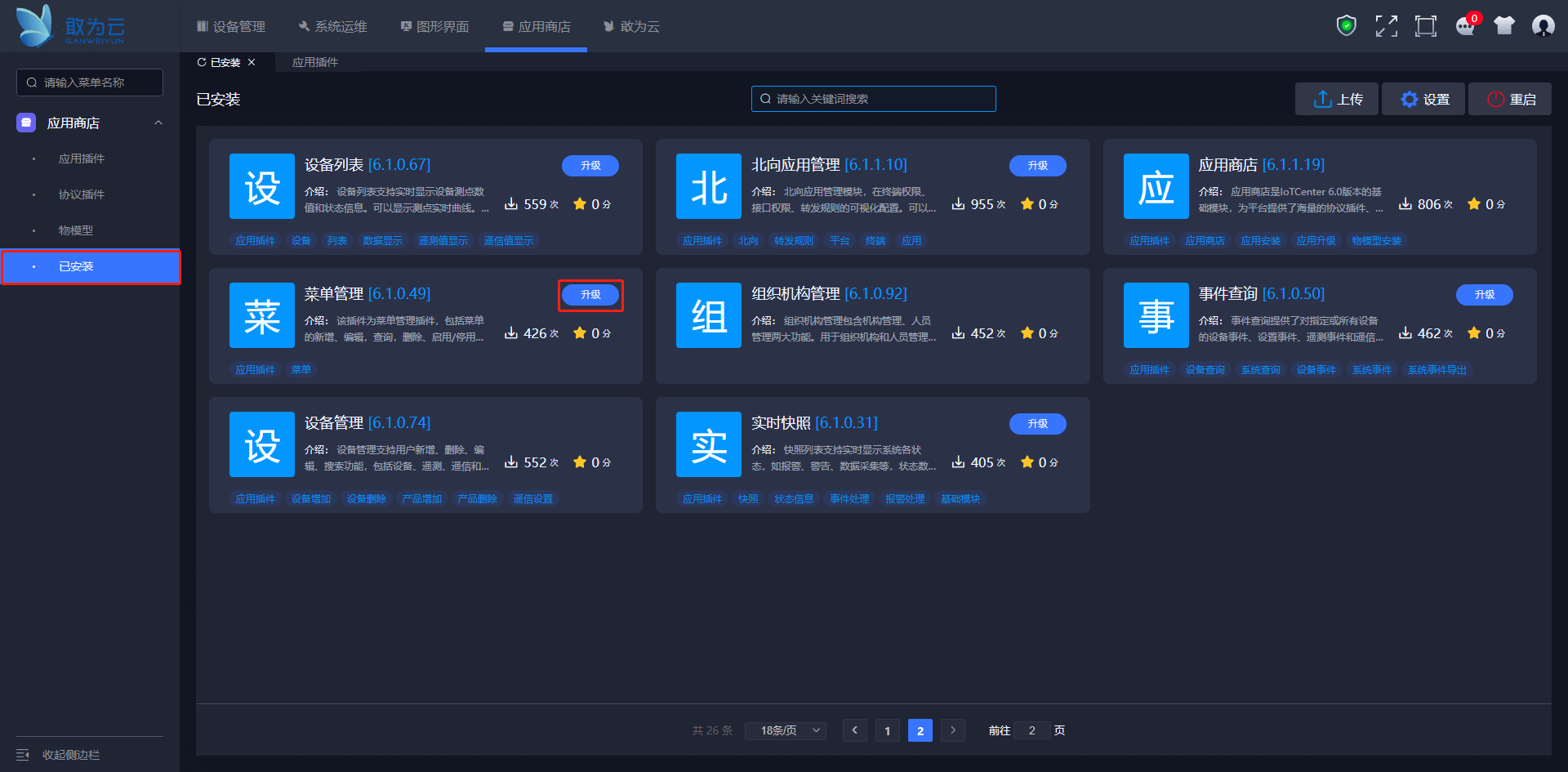- 插件列表中存在升级按钮的则为已上传新版本到应用商店,可以点击升级将该插件升级到最新版本。升级跟安装一样需要重启平台。