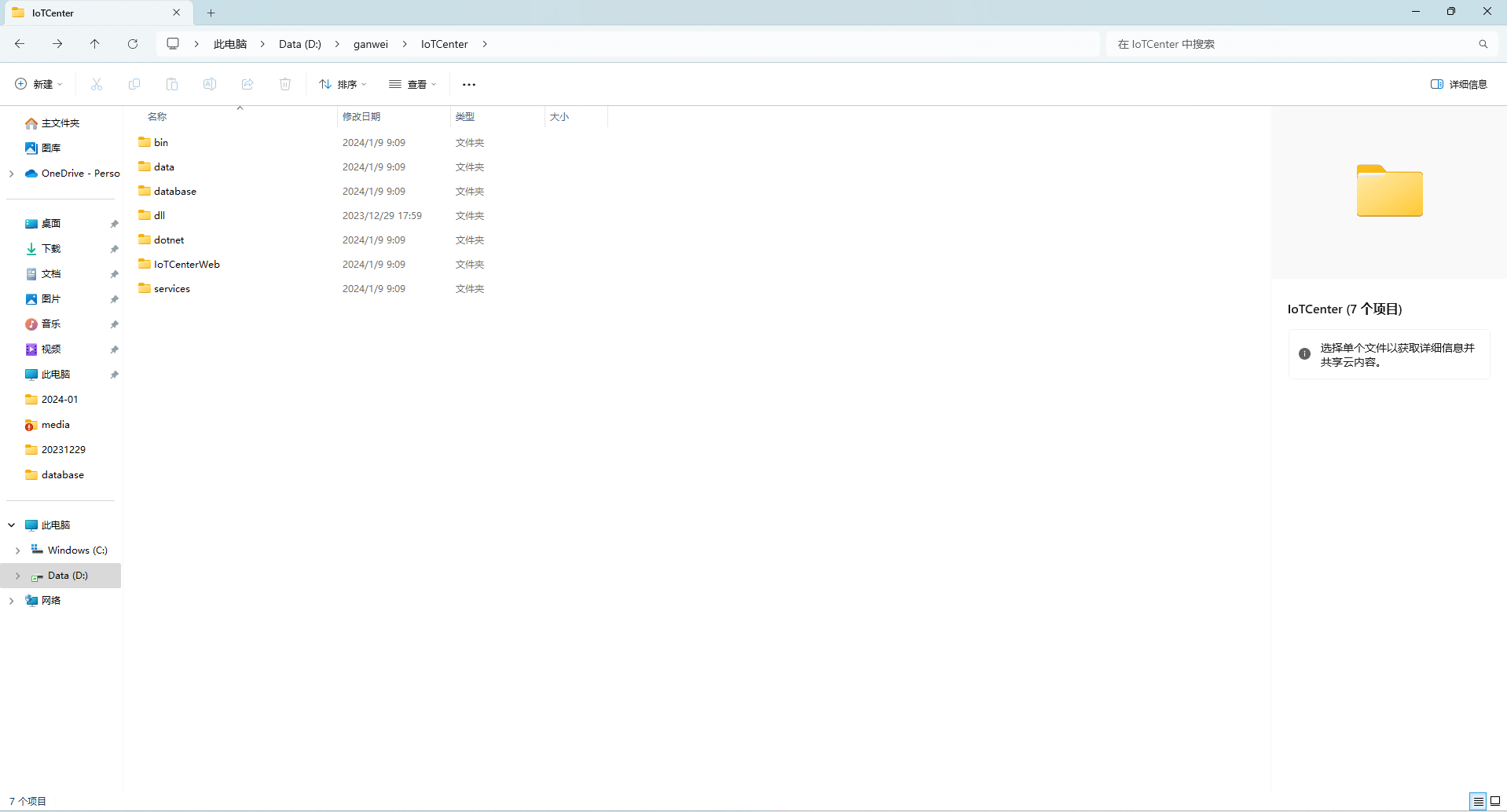 - 解压安装包到D:\ganwei\IoTCenter目录下。