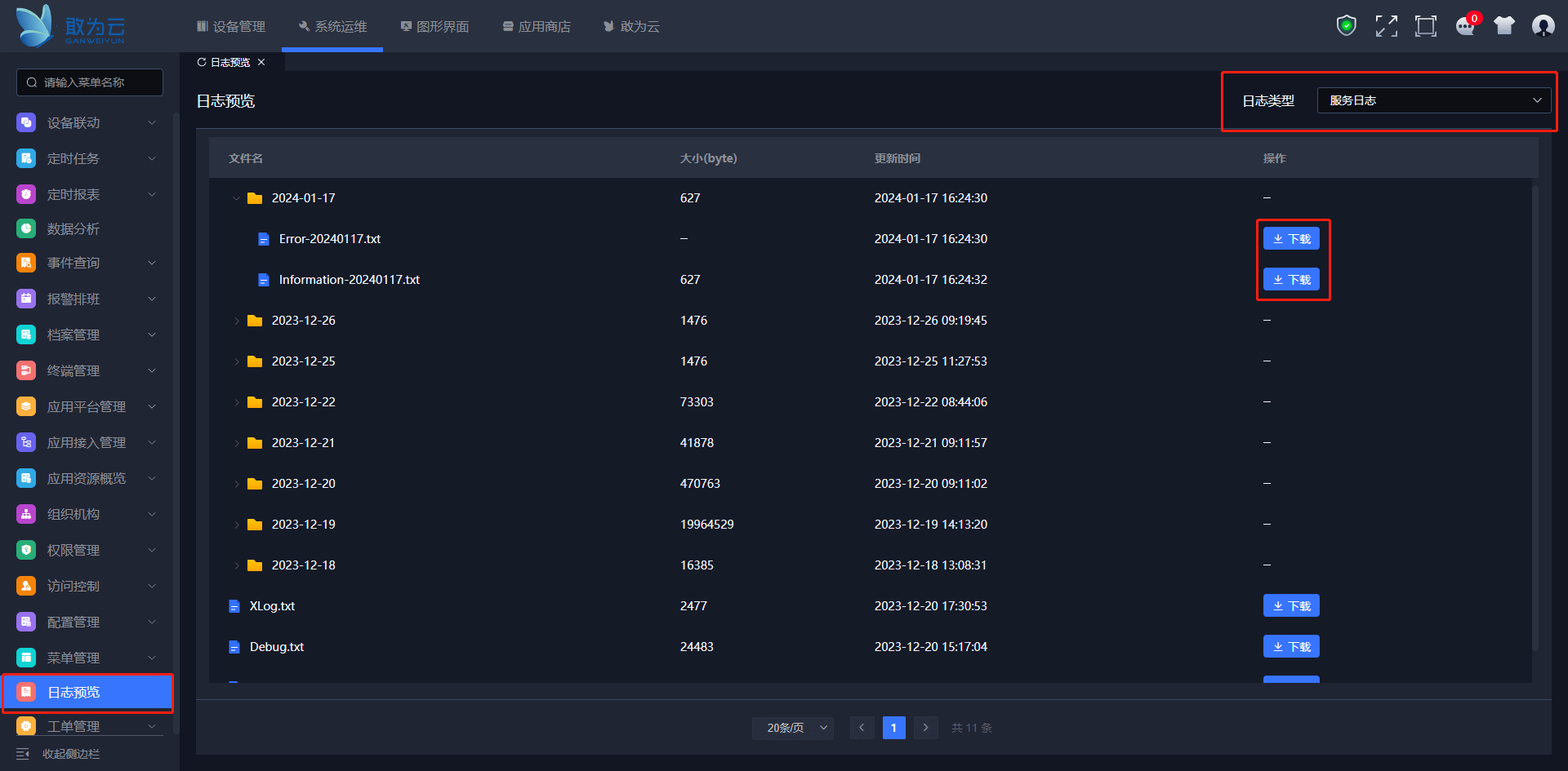 - 在平台找到日志预览,服务日志为网关相关日志。