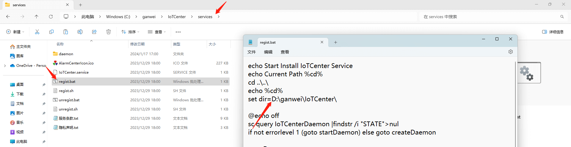 - 将ganwei\IoTCenter\services 中的regist.bat文件使用文本编辑将D:\ganwei\IoTCenter\修改为C:\ganwei\IoTCenter\