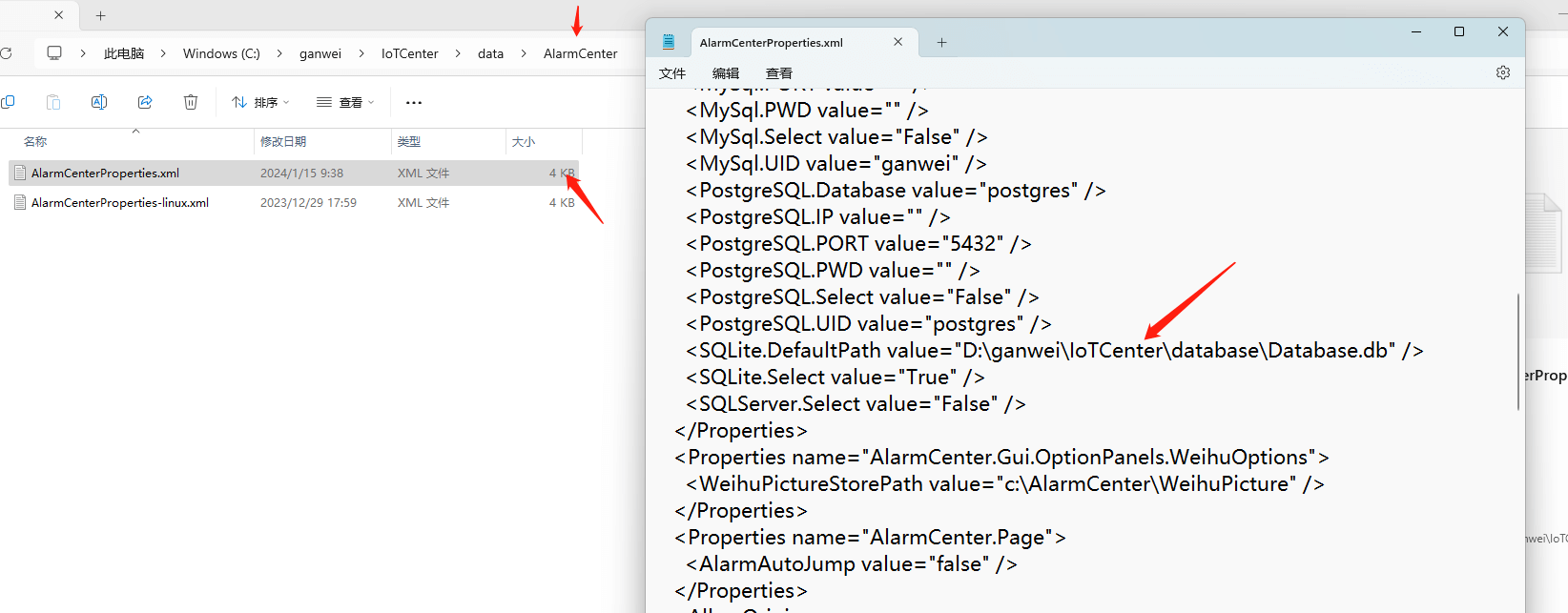 - 将ganwei\IoTCenter\data\AlarmCenter中的AlarmCenterProperties.xml文件使用文本编辑将SQLite.DefaultPath的值由原本的 D:\ganwei\IoTCenter\database\Database.db修改为C:\ganwei\IoTCenter\database\Database.db