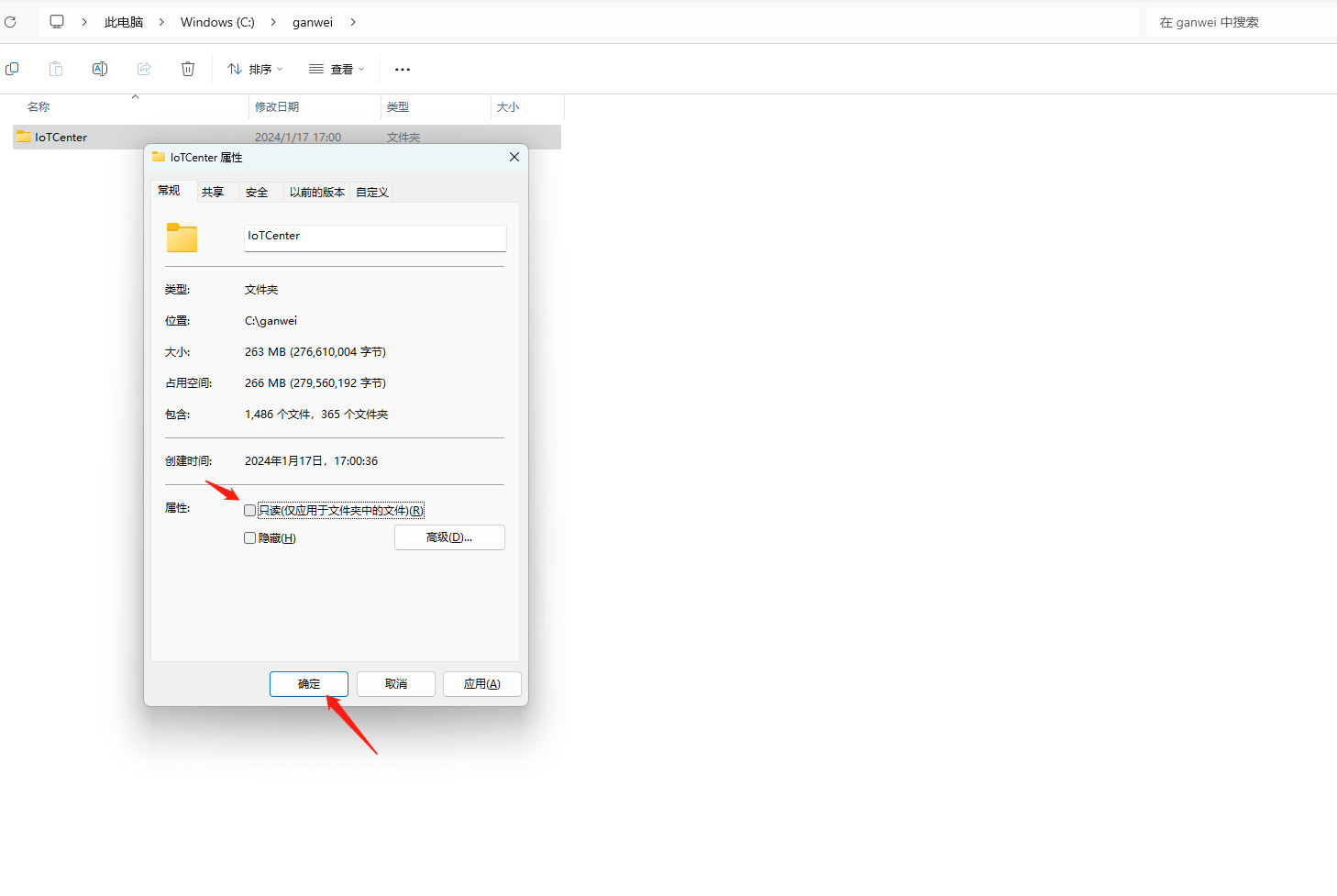 - C盘可能会存在读取权限问题。 右击IoTCenter文件夹-选择属性。默认为只读。