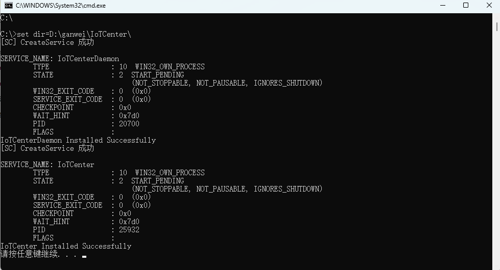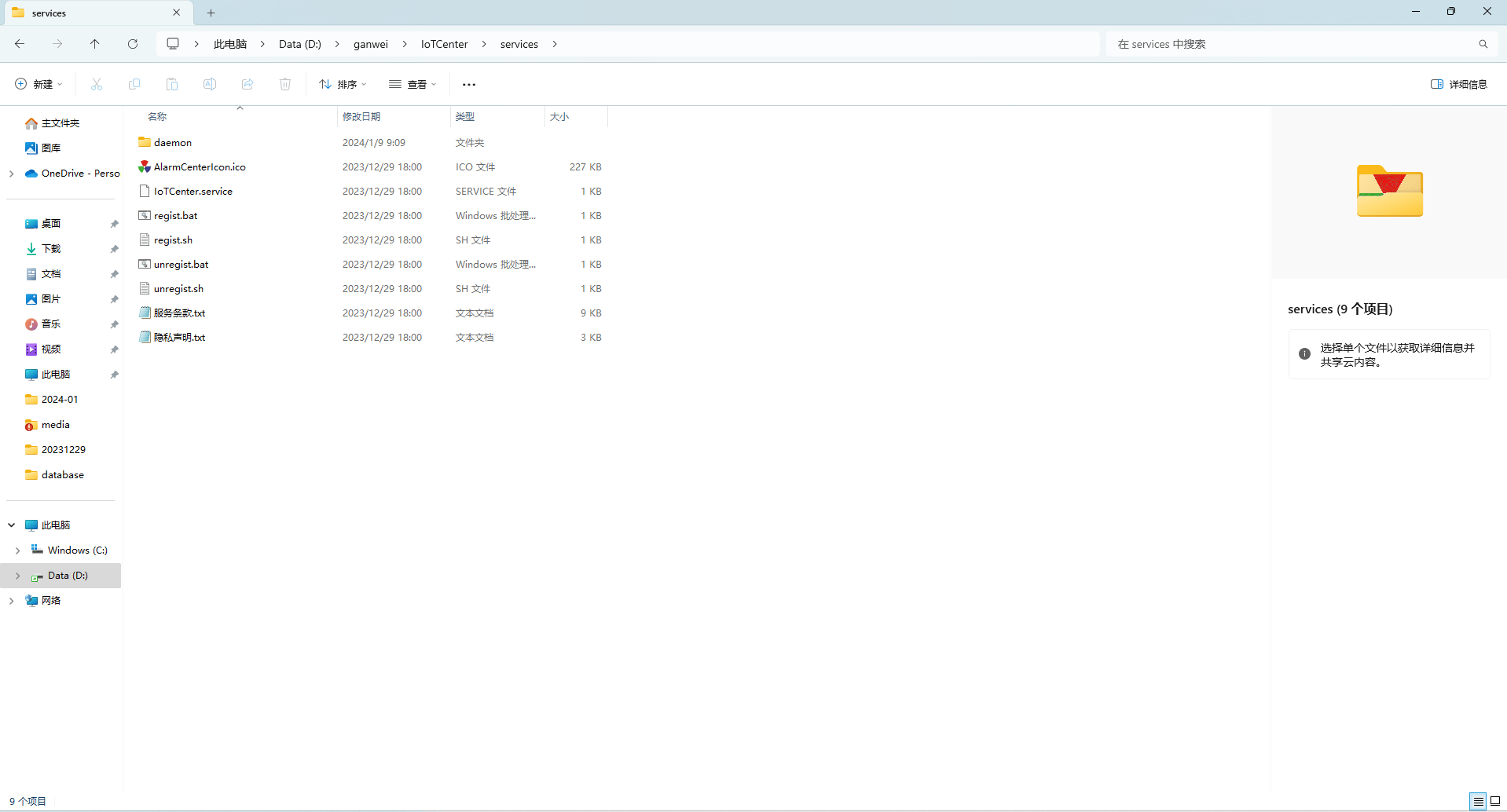 - 进入D:\ganwei\IoTCenter\services目录下使用services\regist.bat脚本注册服务,需要以管理员身份运行。