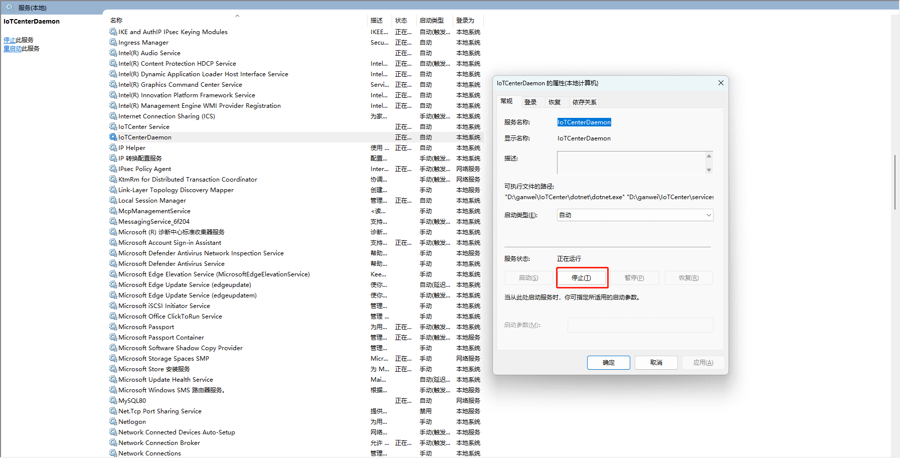 windows下强制停止,需首先停止IoTCenterDaemon服务守护进程,再停止IoTCenter。可使用sc stop xxx来停止,或使用windows界面操作。