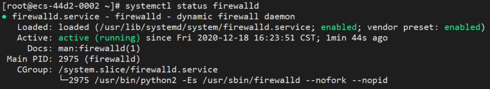 systemctl status firewalld如果显示类似如下,则表示本机有启动firewalld服务,否则无需后续执行防火墙命令的操作。