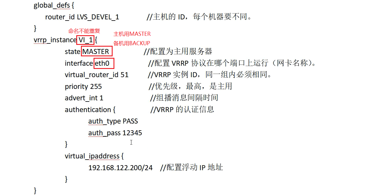 yum install keepalived然后,配置主备服务器的keepalived.conf: