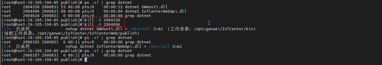 cd/opt/ganwei/IoTCenter/bin/ nohup dotnet GWHost1.dll >/dev/null 2>&1 &cd/opt/ganwei/IoTCenter/IoTCenterWeb/publish/ nohup dotnet IoTCenterWebApi.dll >/dev/null 2>&1 &