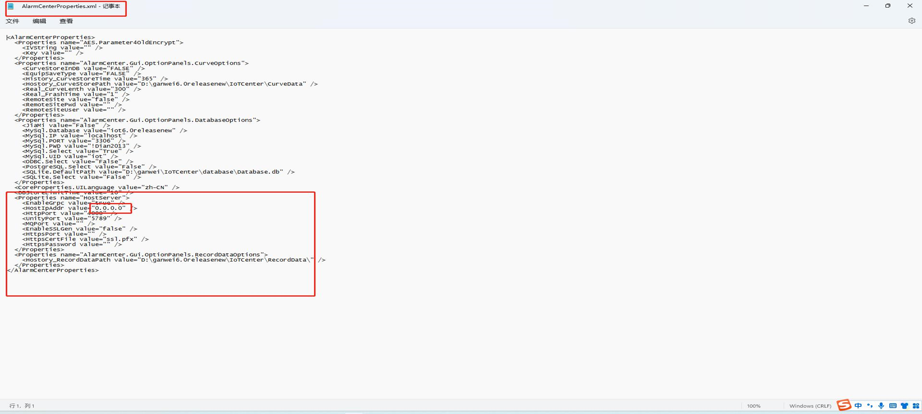 A: 此问题是由于\IoTCenter\data\AlarmCenter目录下的AlarmCenterProperties.xml配置文件中没有配置全网监听导致。将上述文件中HostIpAddr字段的Value值配置为0.0.0.0,以开启全网监听,如下图所示:
