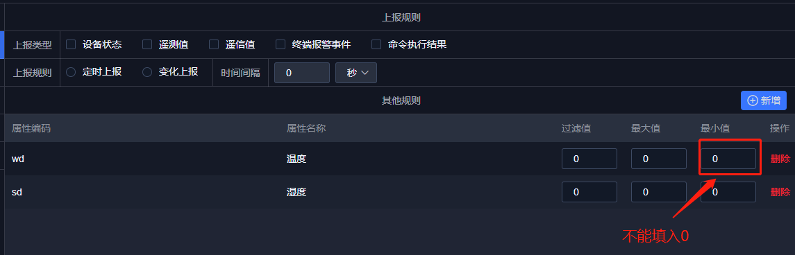 A: 北向转发规则引擎中配置过滤规则时,最小值不能填入0,如下图所示: