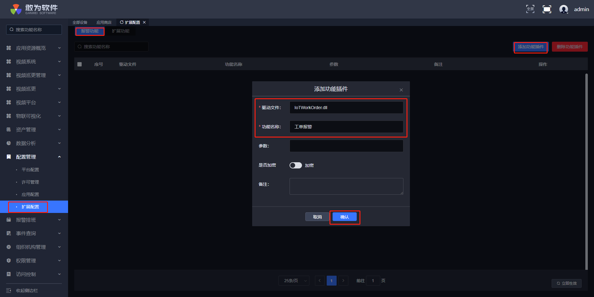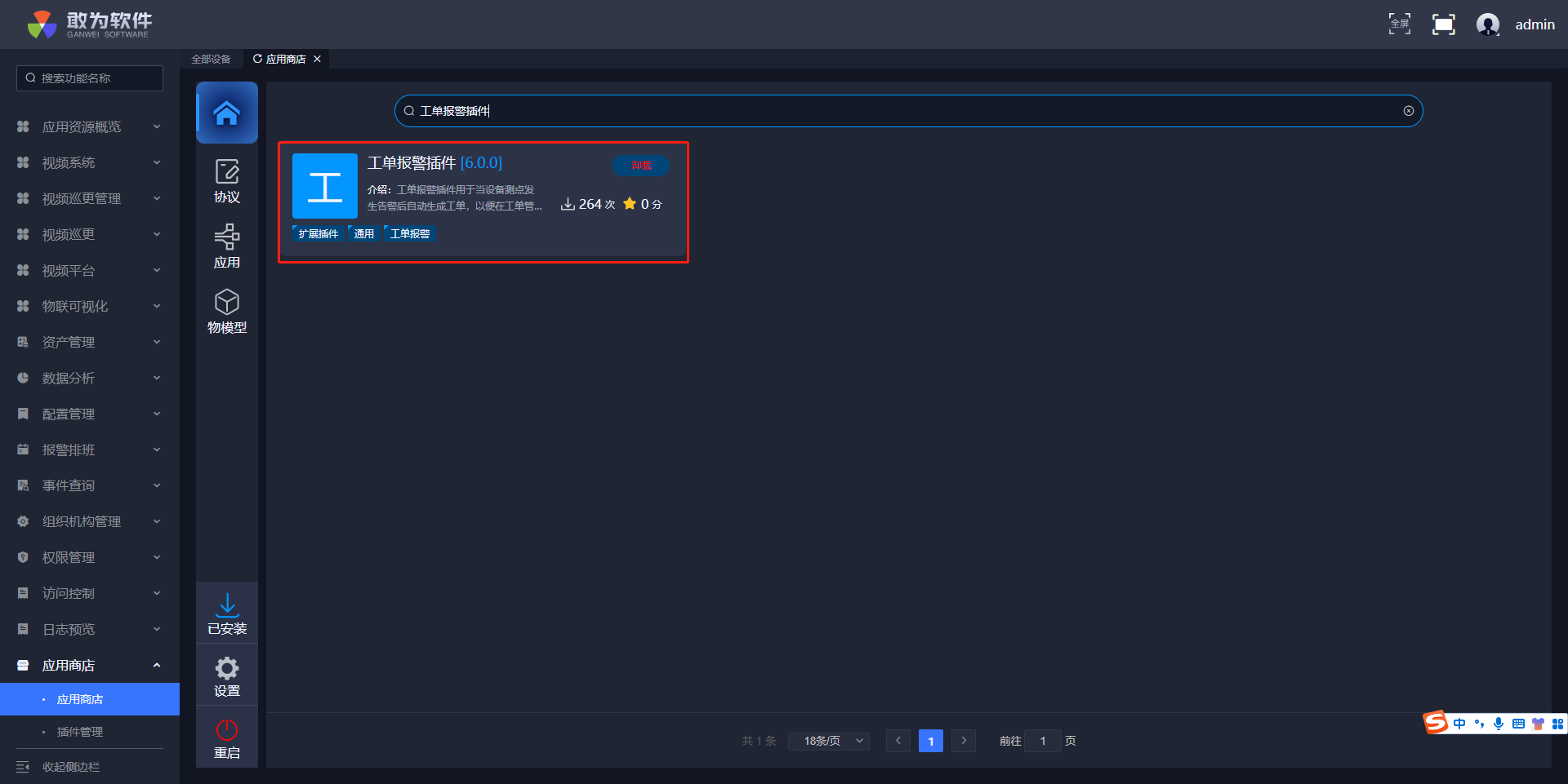 业务插件包括了扩展插件和应用插件。应用插件主要是业务流程中的一些应用模块,如工单管理,访客管理,这一类插件的共同特色是都有管理界面实现流程;扩展插件用于扩展业务流程中的功能,以适应复杂的业务场景,如定时抄表、平台级联等等都需要用到扩展插件。