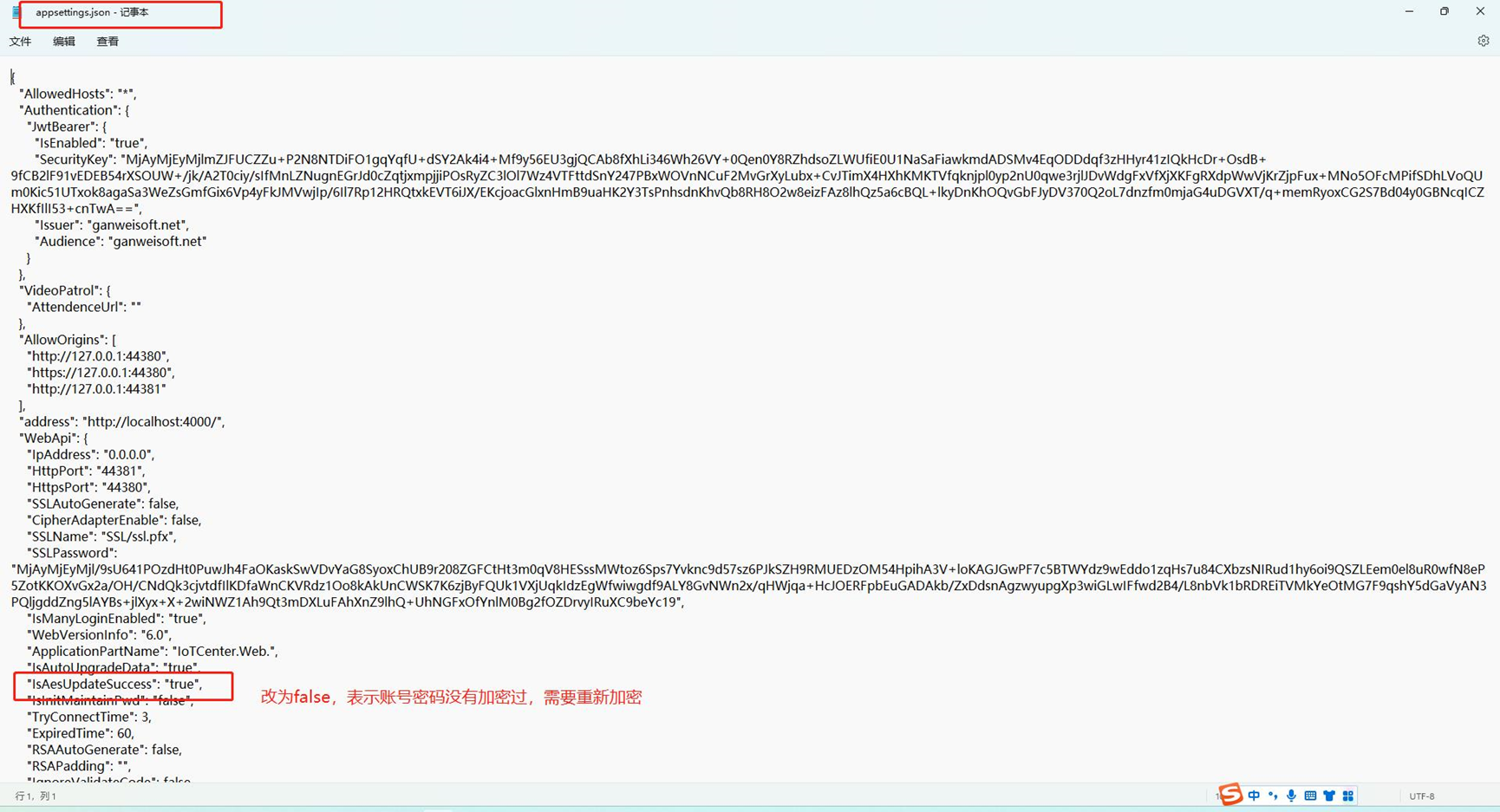A: 在确认账号密码输入正确的情况下,出现密码错误的原因是GWUser表中的数据没有正确加密导致。修改\IoTCenter\IoTCenterWeb\publish目录下的appsettings.json文件中的IsAesUpdateSuccess字段的值为false,系统会自动对GWUser表中的数据进行加密。如下图所示: