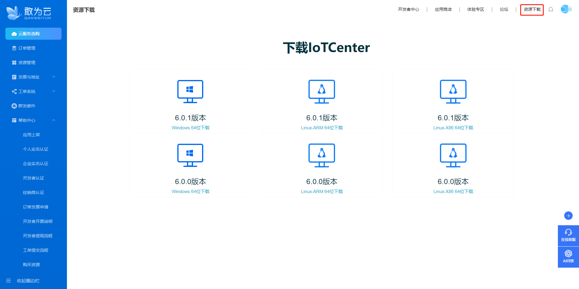 注册登录敢为云官网后在资源下载 (opens new window)页面中下载需要的IoTCenter。