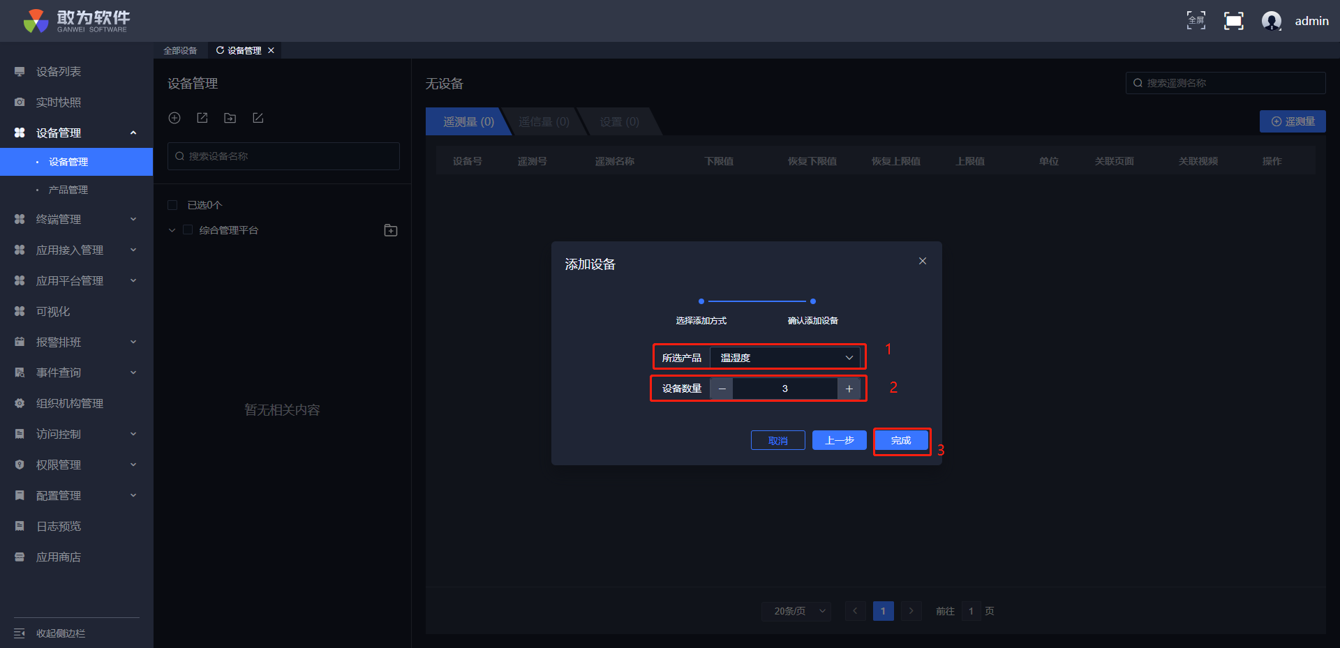 4. 在所选产品中选择温湿度,设备数量设置为3。