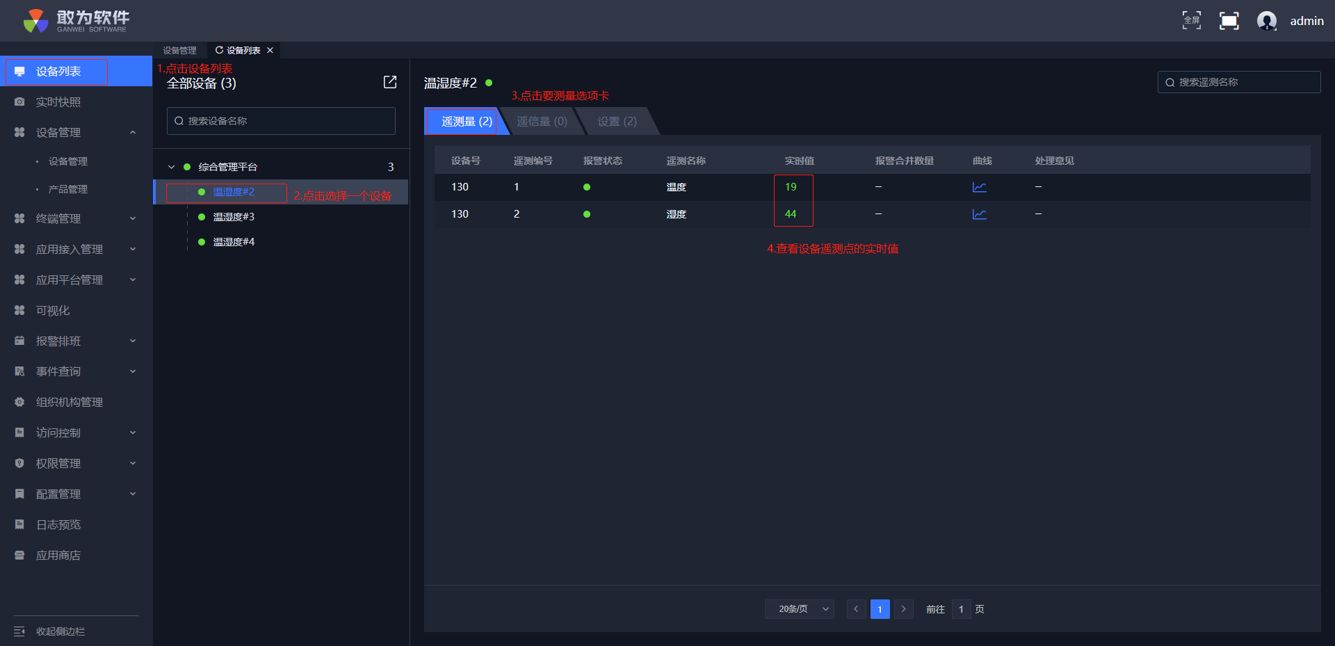 5. 在设备添加成功后,在设备列表中查看每个设备温度和湿度的实时值。