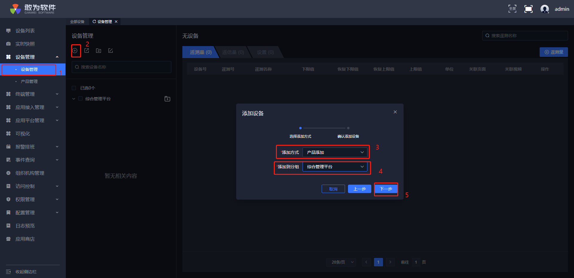 3. 在打开的设备管理页面中,点击“⊕”按钮,在弹出的添加设备对话框中,选择添加方式为产品添加,选择添加到的分组,默认只有一个分组综合管理平台,点击下一步按钮。如下如所示:
