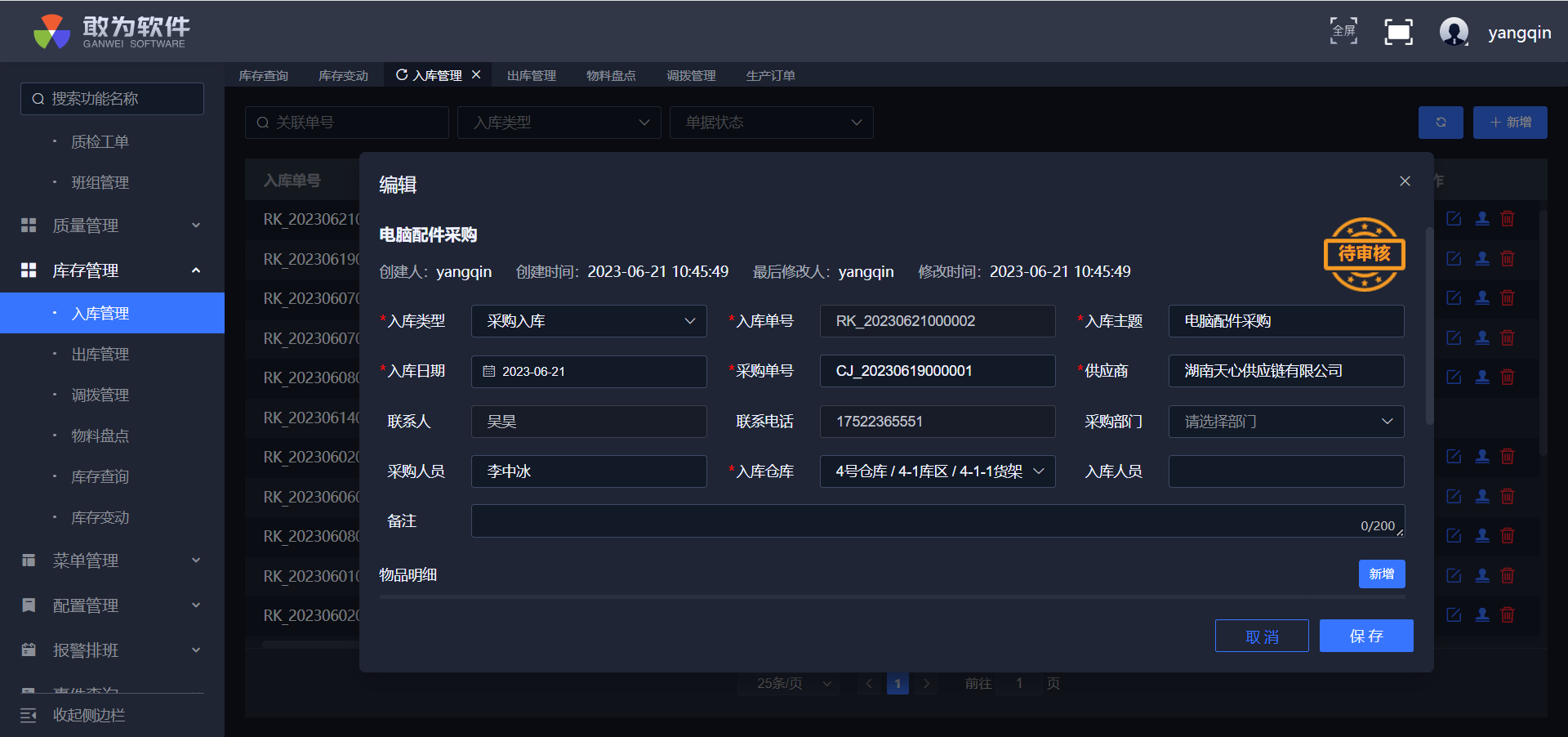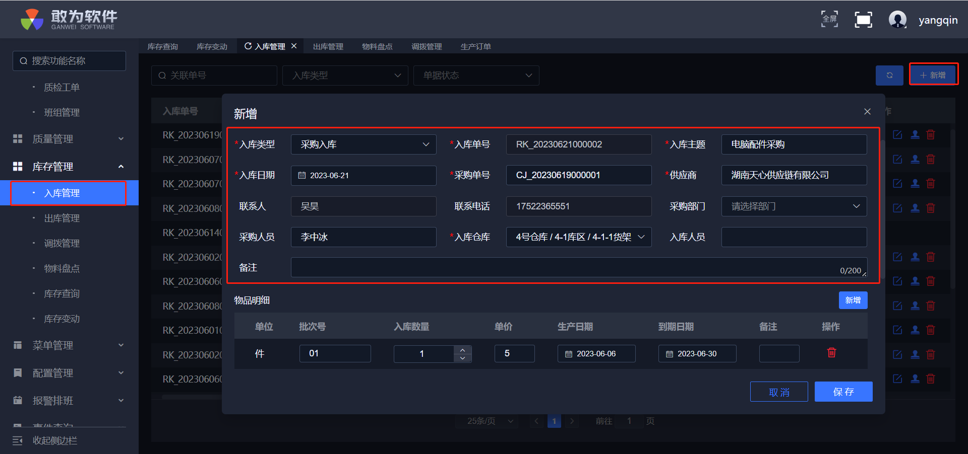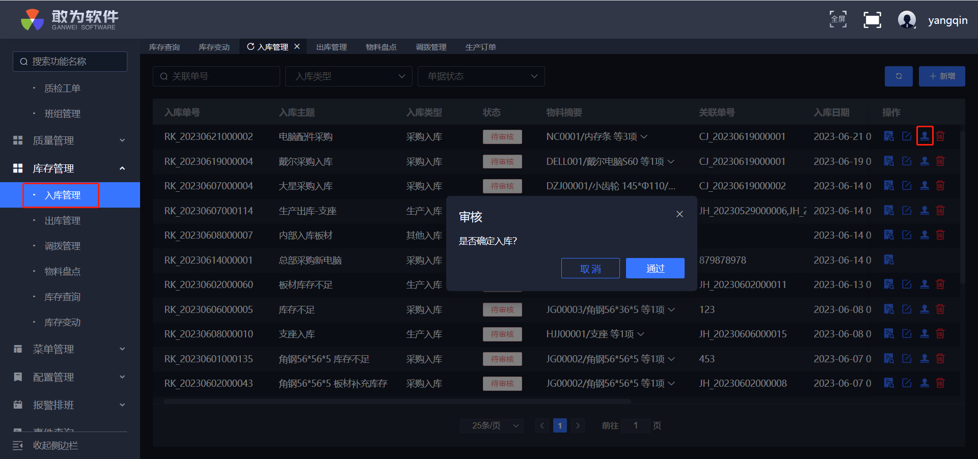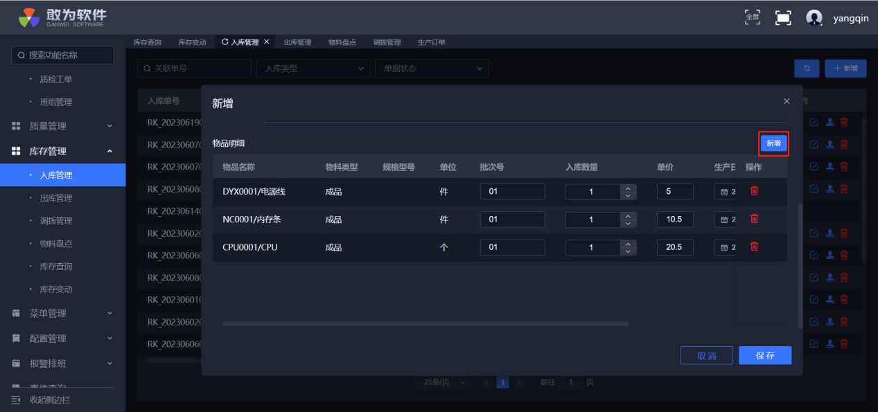| 1 | 入库管理 | 支持生产入库、采购入库、其他入库的方式将物料入库到指定仓库 |