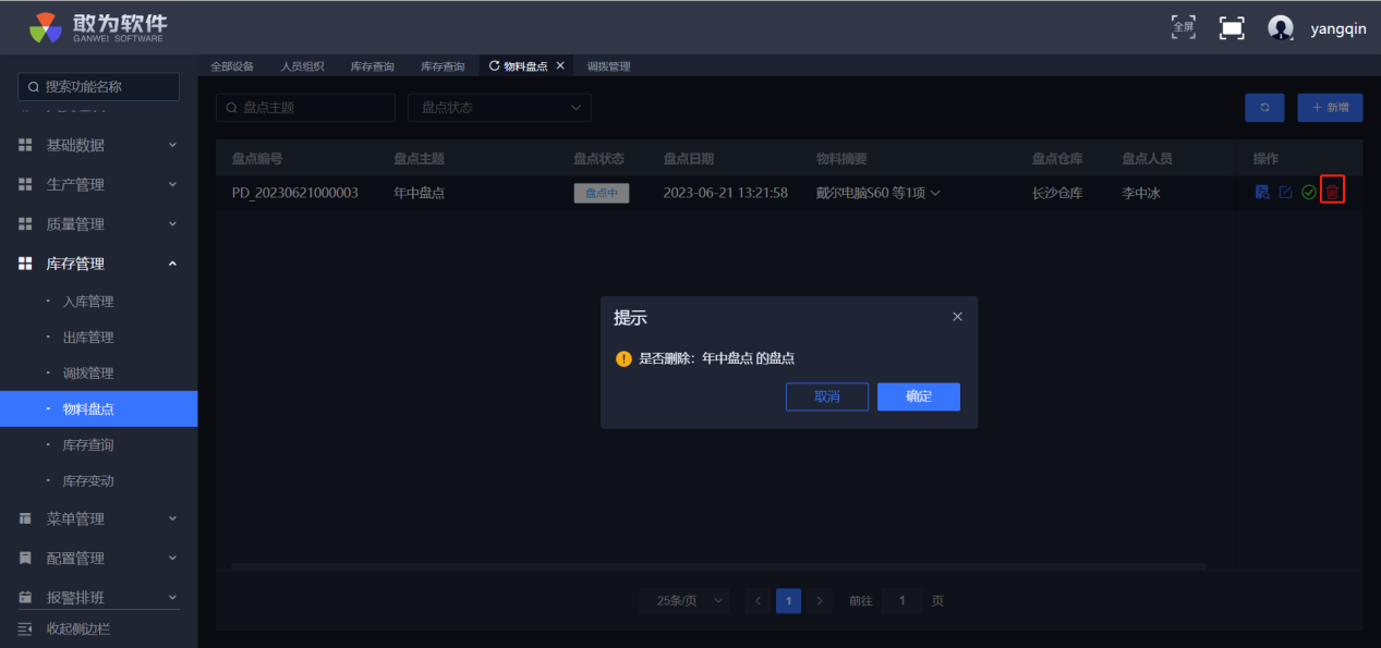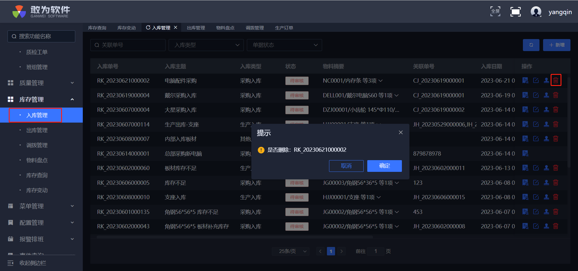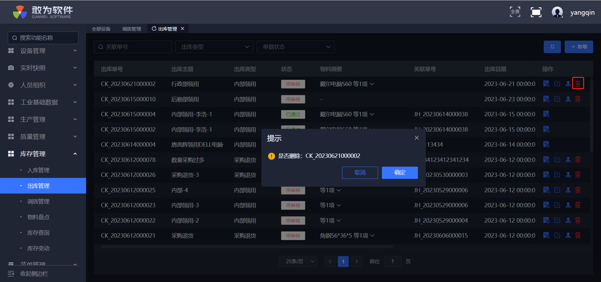 在弹出层中点击确定按钮,即可删除当前调拨单