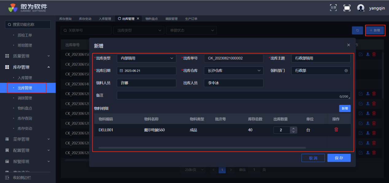 | 2 | 出库管理 | 支持领料出库、采购出库、退料出库、其他出库。 的方式将物料从指定仓库出库 |