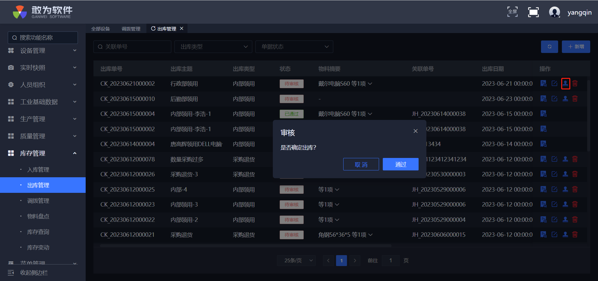 在弹出层中点击通过按钮,当前单据即可出库成功。