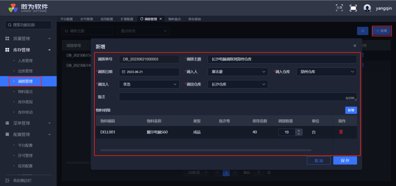| 3 | 调拨管理 | 支持从一个A仓库调拨到B仓库,调拨成功后A仓库数量会减少,B仓库会增加相应的数量的物料 |