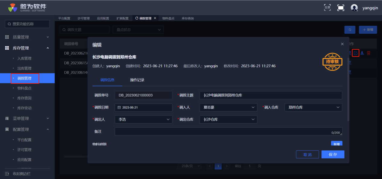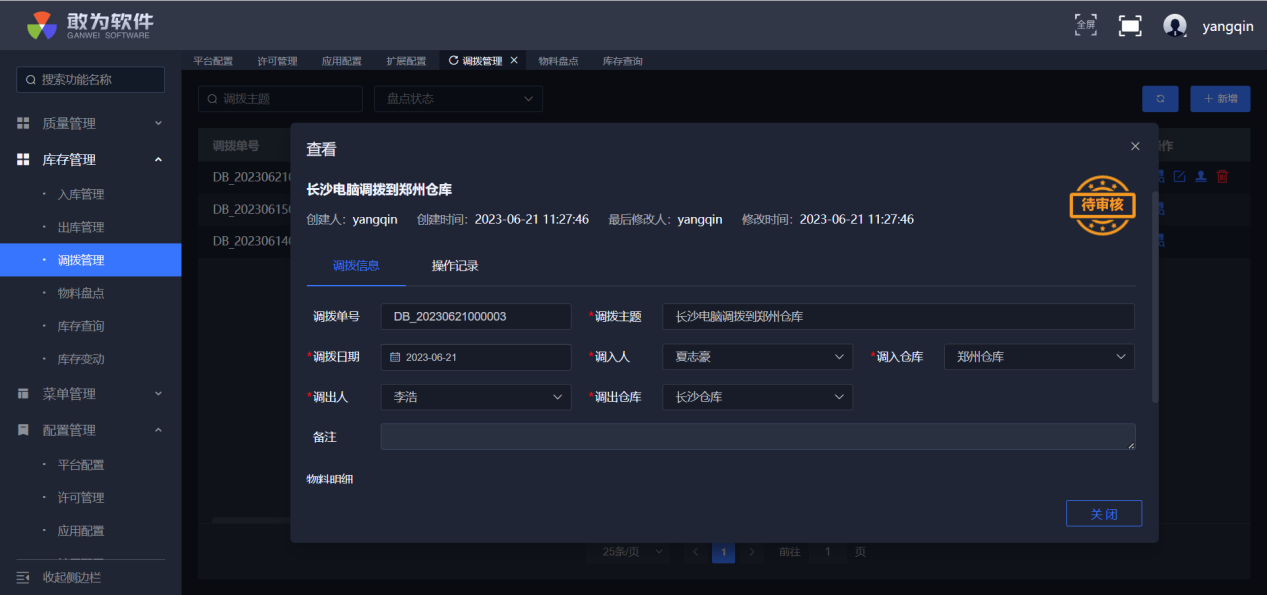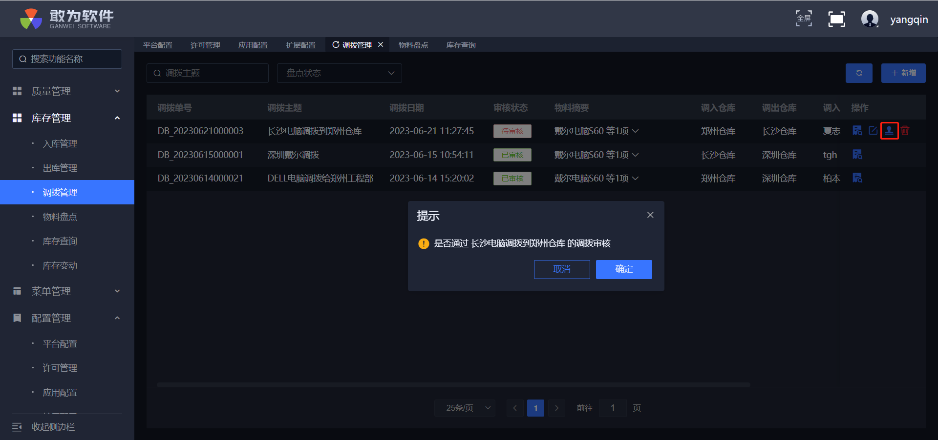 在弹出层中点击确定按钮,当前调拨单即可完成审核。