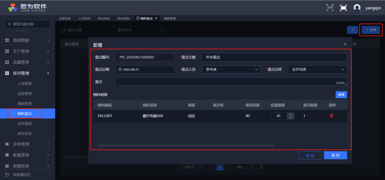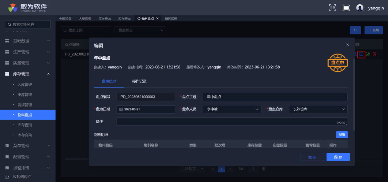 | 4 | 物料盘点 | 支持物料的清查核算。及时调整库存数量 |