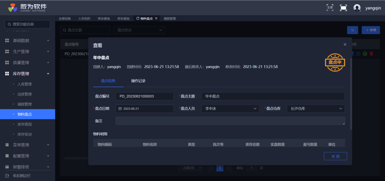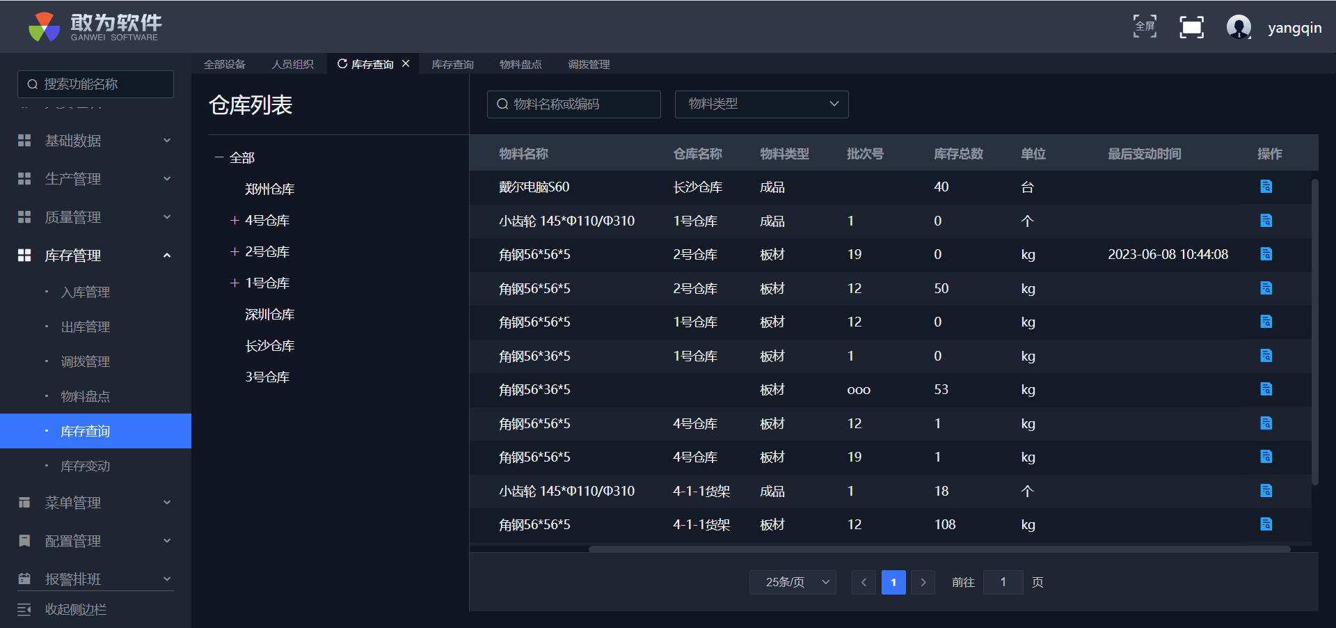库存查询是用于查看系统内物料的当前库存数量,也可根据需求查询每个仓库、库区、货架的物料数量。
