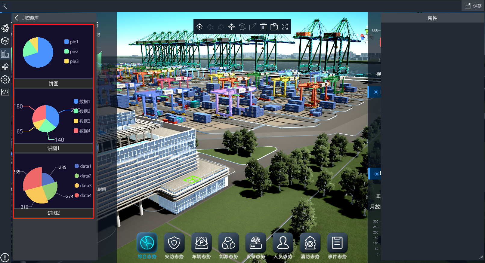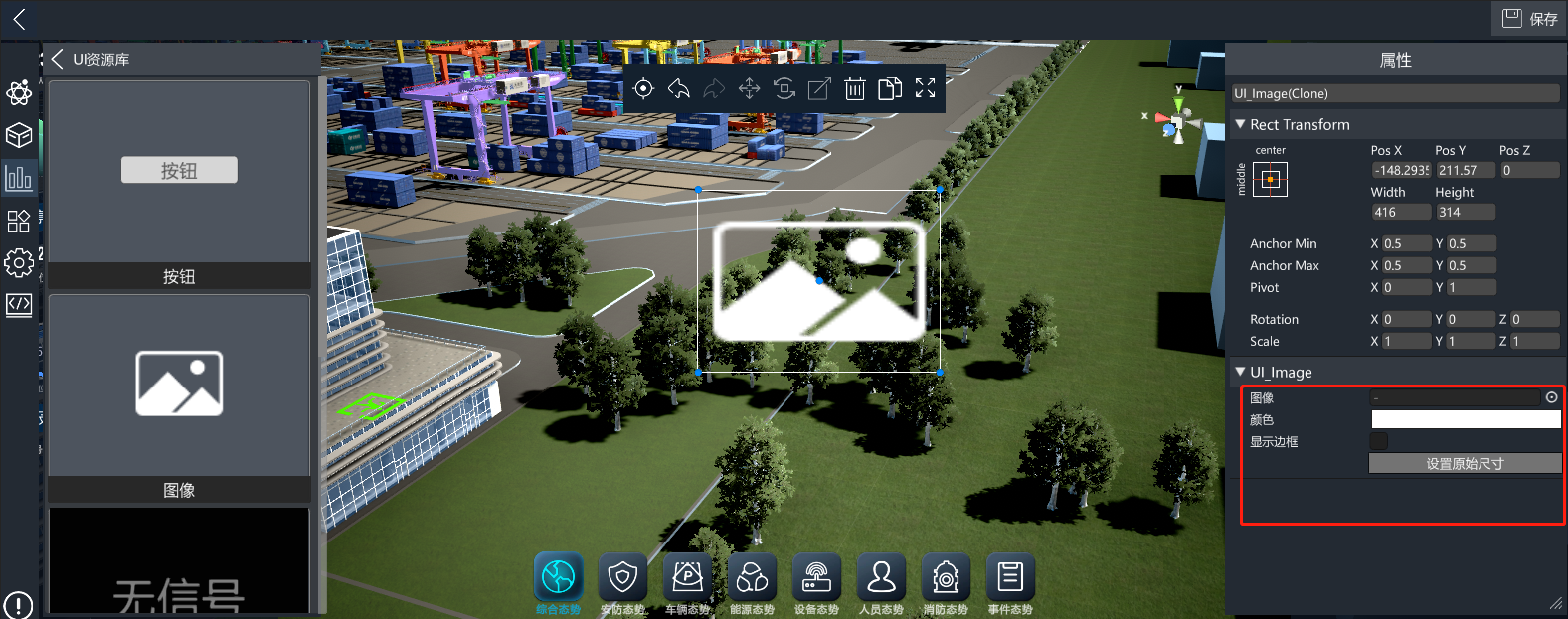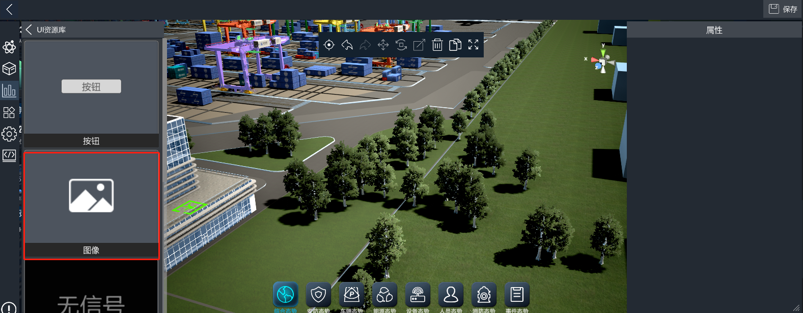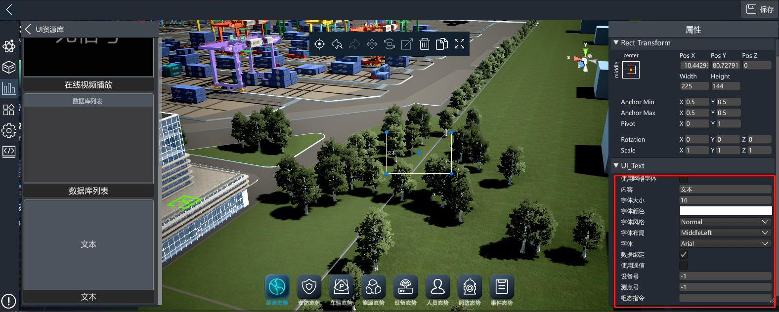 3D可视化低代码平台提供了丰富的UI控件,进入编辑模式后,点击左侧的UI控件库按钮,打开UI控件库分类列表,点击对应分类,可查看改分类下的UI控件,将UI控件拖入场景中即可使用。