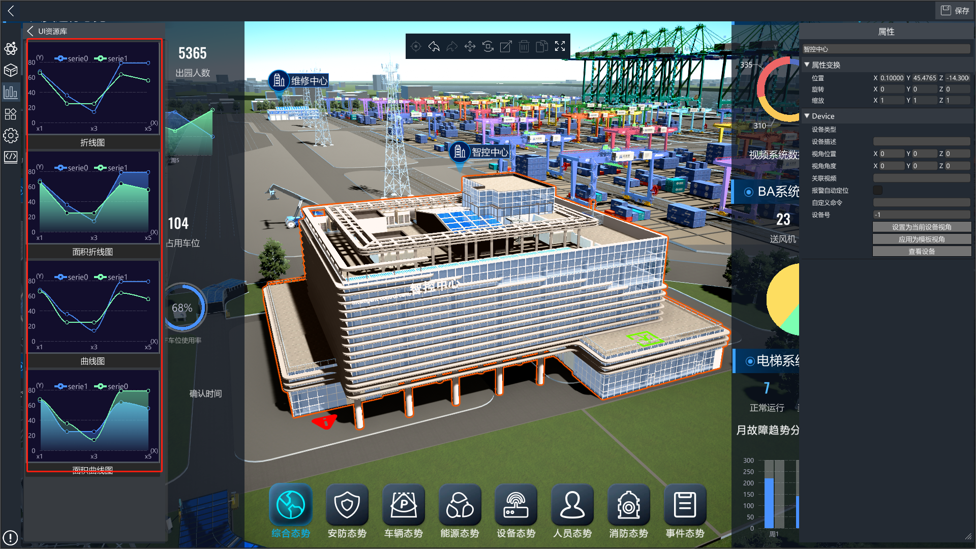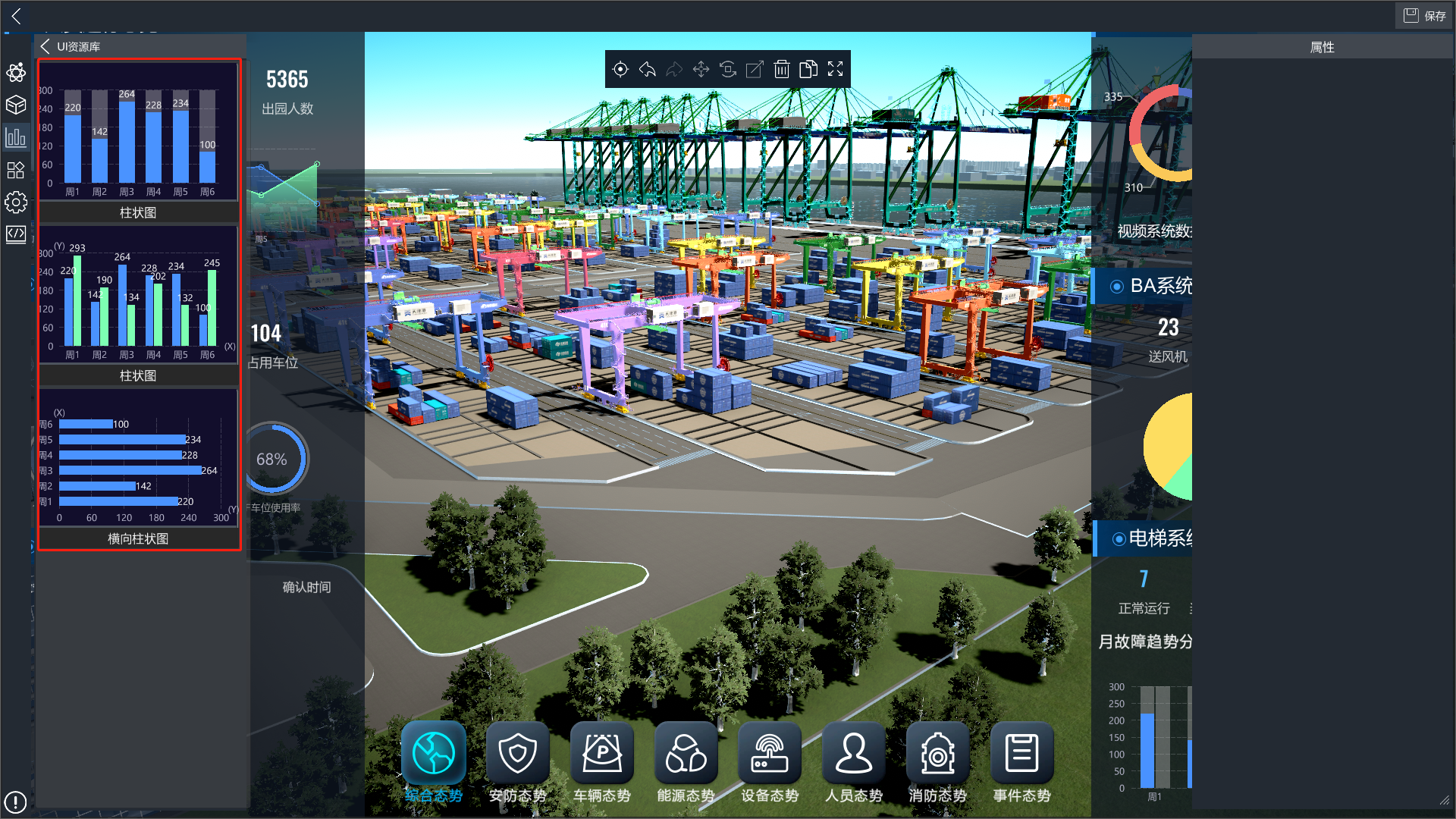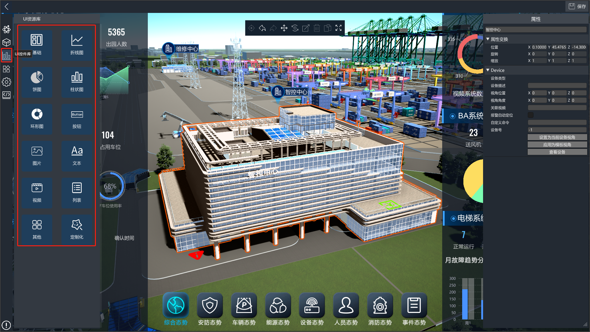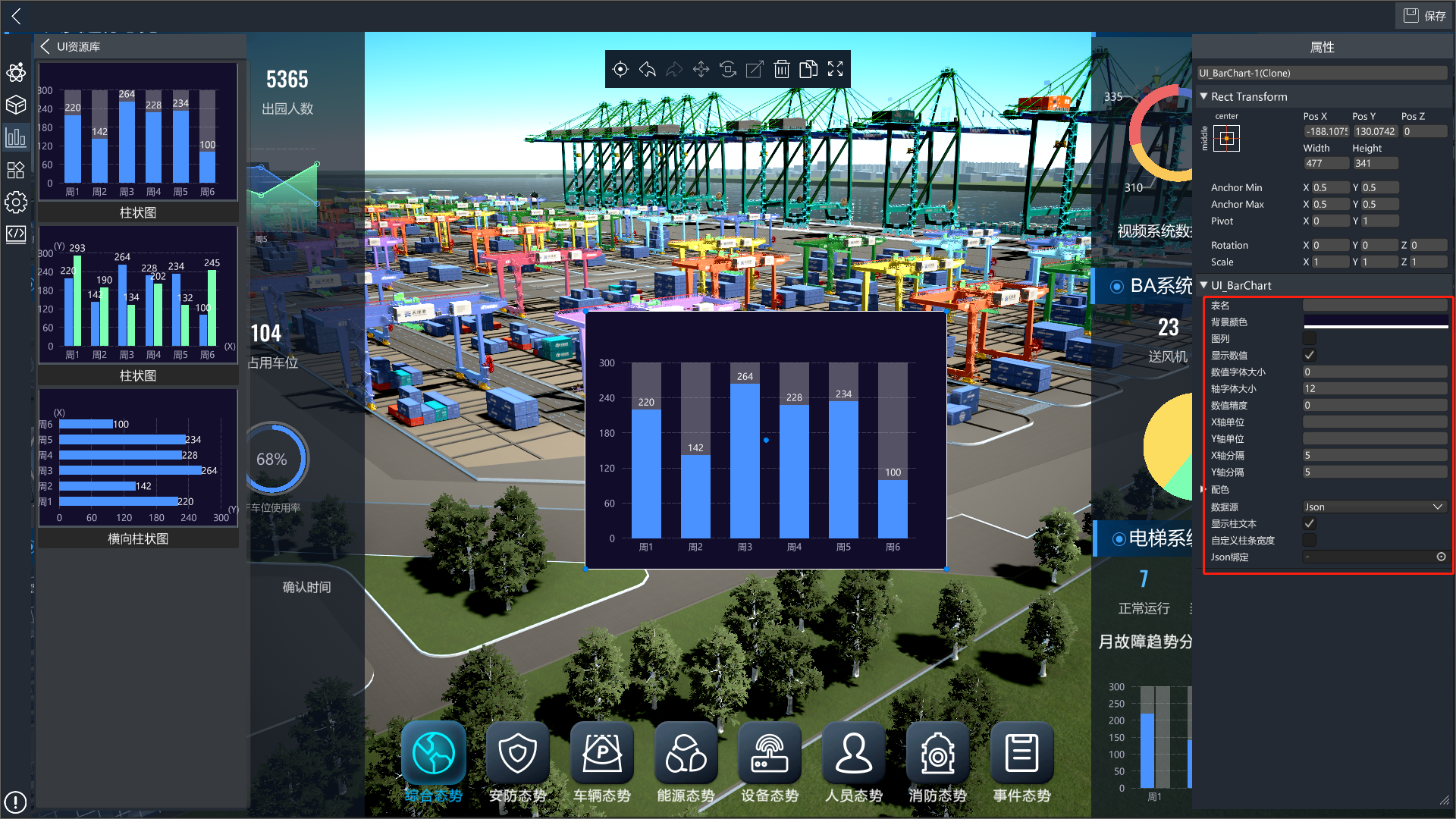 3D可视化低代码平台提供了丰富的UI控件,进入编辑模式后,点击左侧的UI控件库按钮,打开UI控件库分类列表,点击对应分类,可查看改分类下的UI控件,将UI控件拖入场景中即可使用。