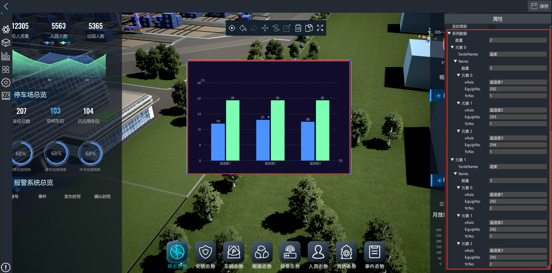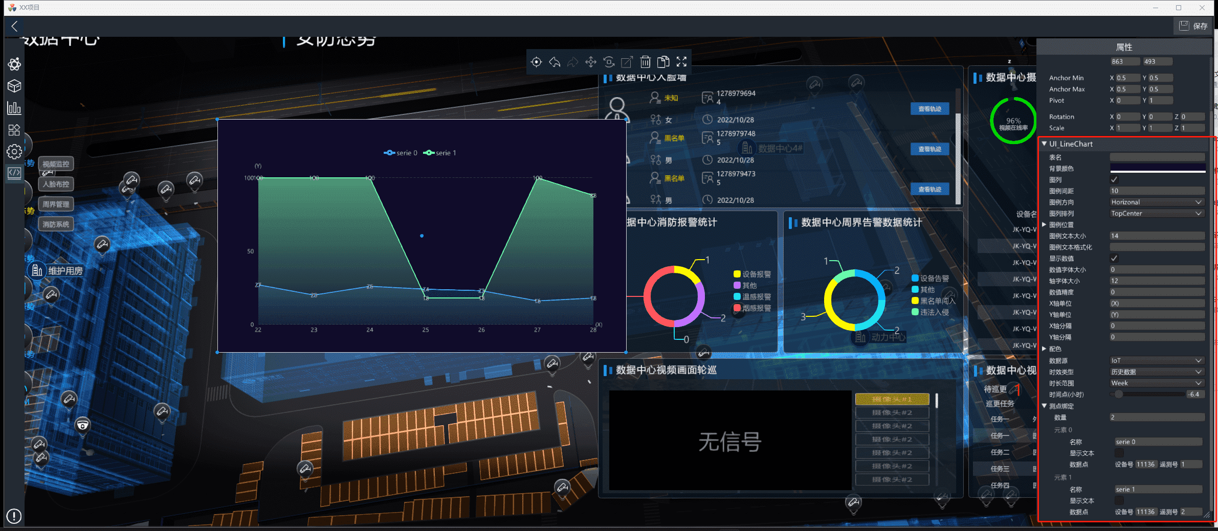 该控件用于轮播从IoTCenter视频平台接入的多个摄像头设备的视频。进入编辑模式后,从UI资源库的视频分类中拖入视频轮播控件控件。数量属性代表轮播的视频数量,同样支持设备号或rtsp流播放,优先设备号播放。