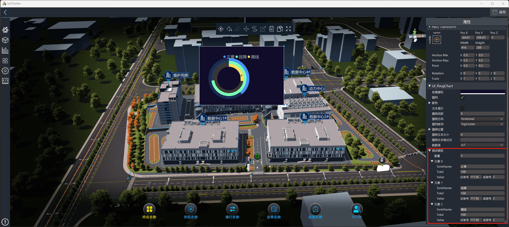 测点绑定:数量:图例的数量。元素X:代表图例的对象。名称:图例的名称。数据点:配置图例绑定的设备号和测点号。