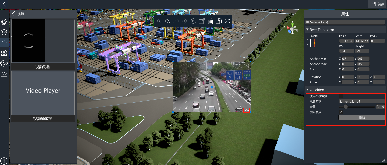 进入编辑模式后,从UI资源库的视频分类中拖入视频播放器控件,并配置视频名称属性的值为上述目录中的视频名称(包括扩展名),点击播放按钮即可进行播放。