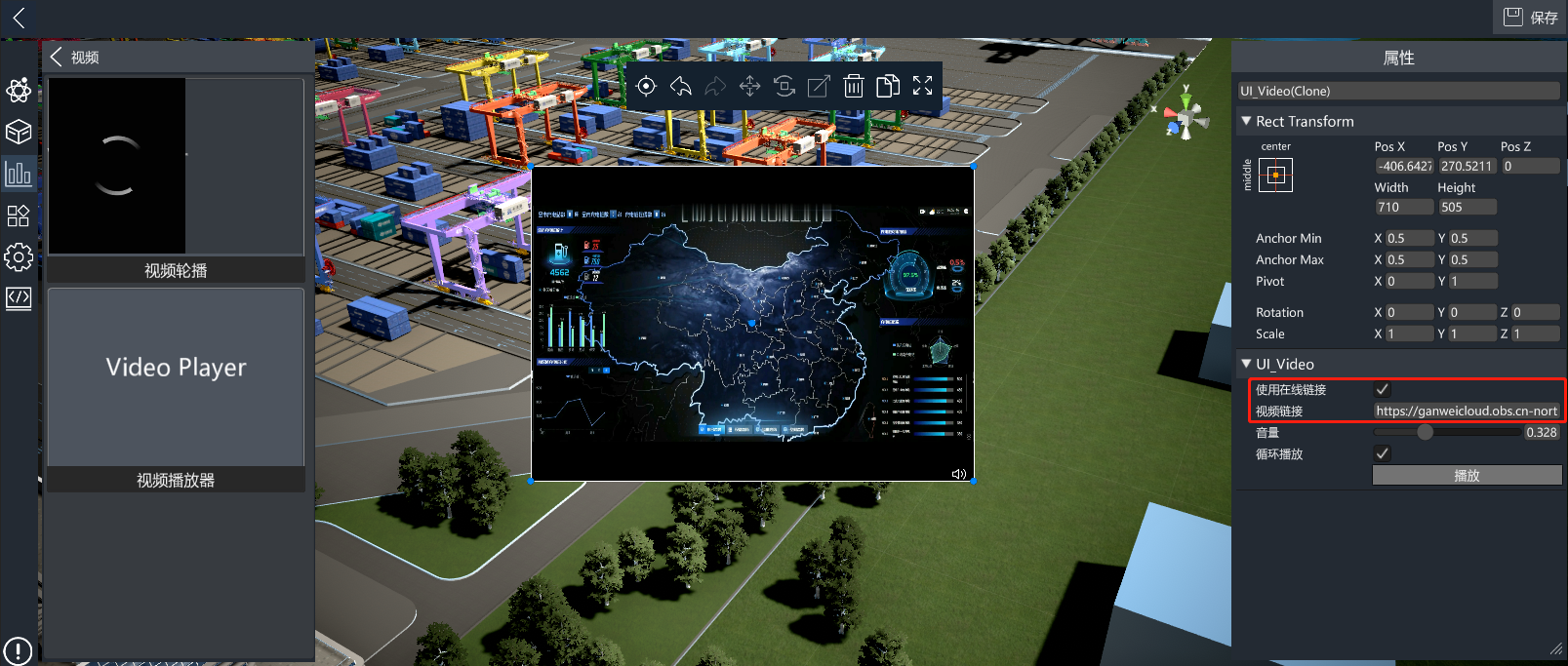 在线视频播放。勾选使用在线视频链接,并在出现的视频链接属性中输入视频地址,视频地址支持Http协议地址。其它与本地视频播放类似。