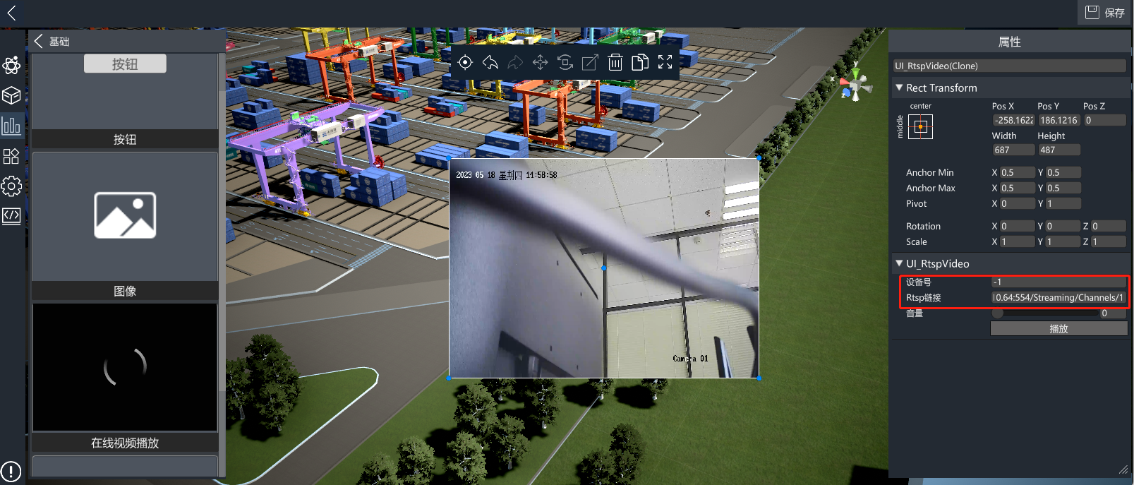 该控件主要用于播放IoTCenter视频平台中接入的摄像头设备的视频。支持设备号或rtsp流播放,优先设备号播放。进入编辑模式后,从UI资源库的基础分类中拖入在线视频播放控件,配置设备号或者Rtsp链接即可。