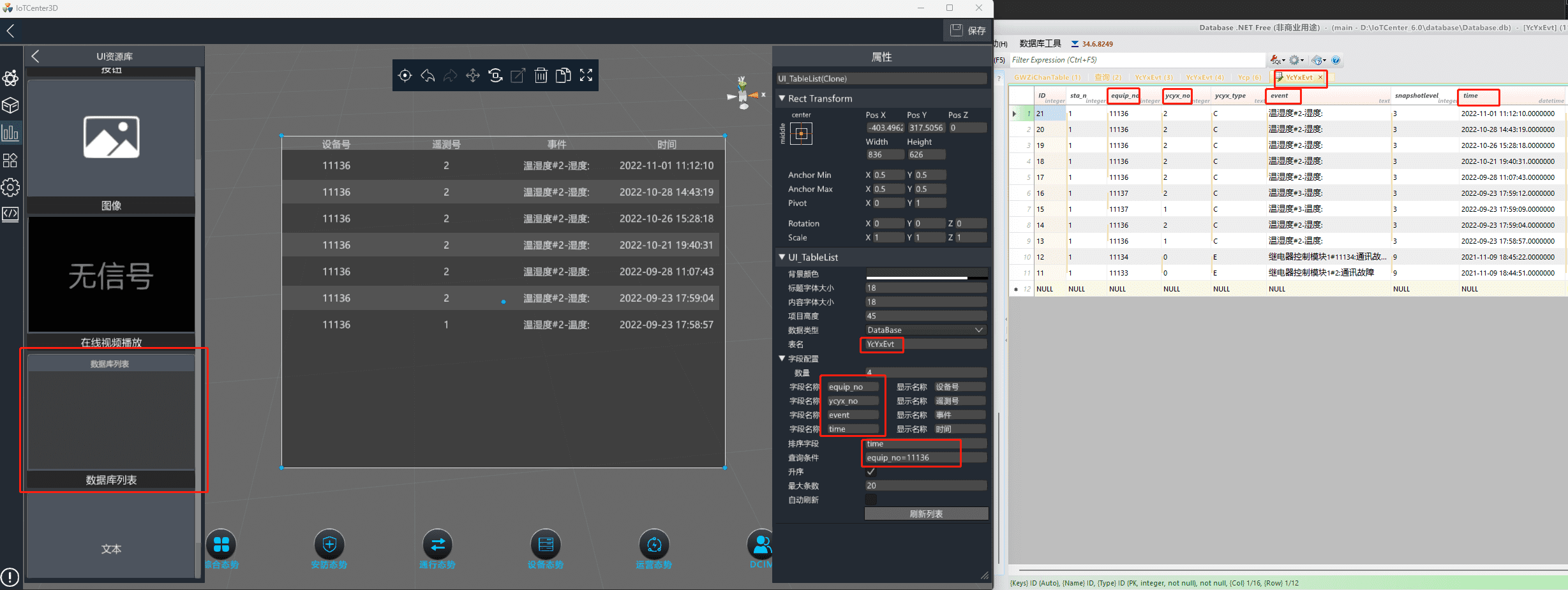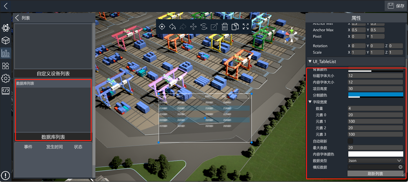 以数据库列表控件为例进行讲解,将控件拖入场景中后,可以在属性面板中对控件进行配置