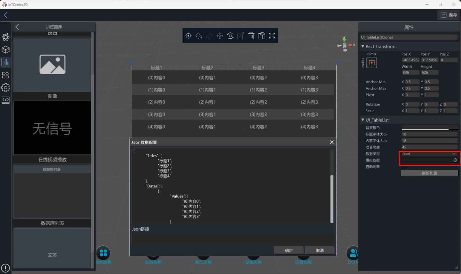 数据类型:DataBase类型支持IoTCenter平台的数据库;Json类型支持http链接数据或模拟数据。