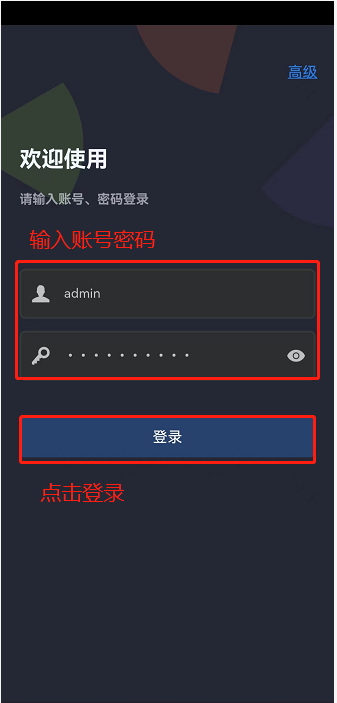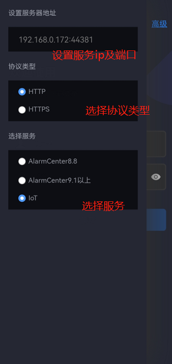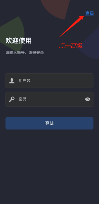 登录:首先点击登录界面“高级”按钮配置服务器地址端口、协议类型、选择服务,然后输入账号密码即可登录
