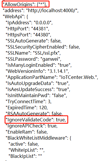 因APP需要匿名访问并且登录时的验证码使用的是滑动验证码而不是PC端的验证码,所以需要在IoTCenter安装目录下的IoTCenterWeb\publish\appsettings.json文件中更改配置: