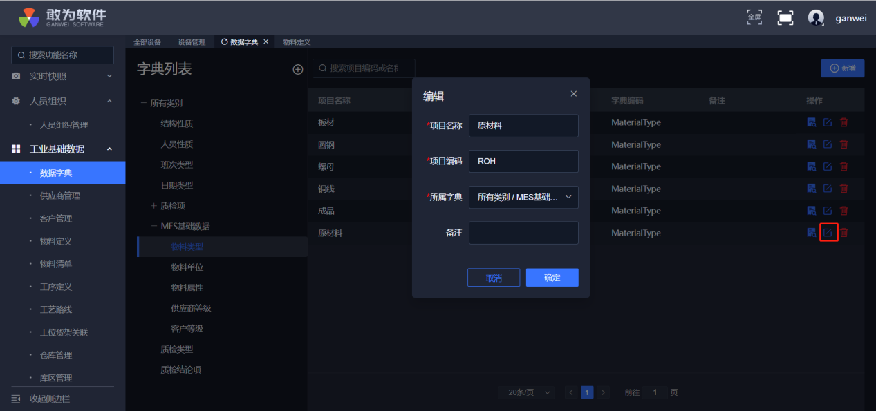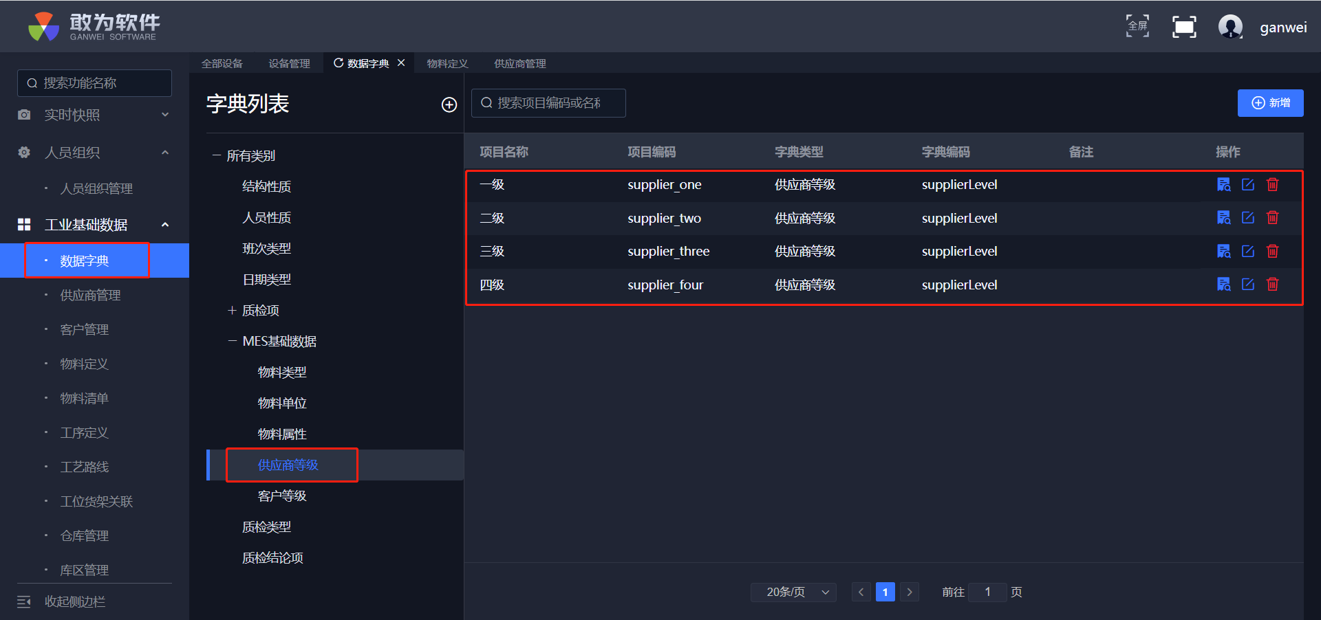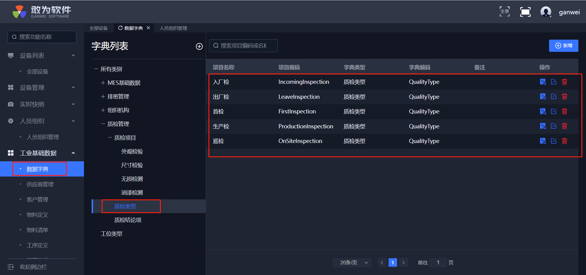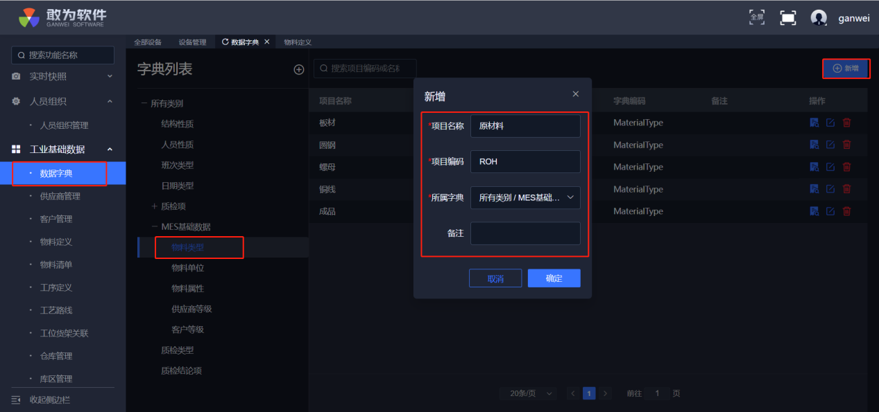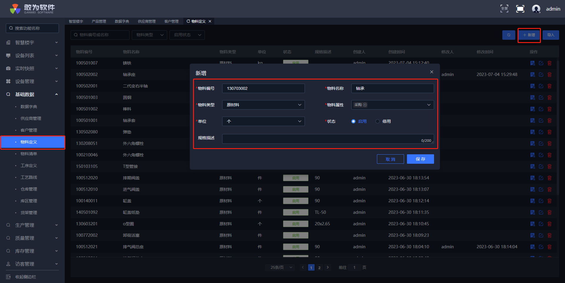 | 1 | 数据字典 | 支持物料类型、物料单位、物料属性、供应商等级、客户等级、班次类型、日期类型、质检项目、质检类型、质检结论项、机构类型、人员类型的自定义与维护。 |