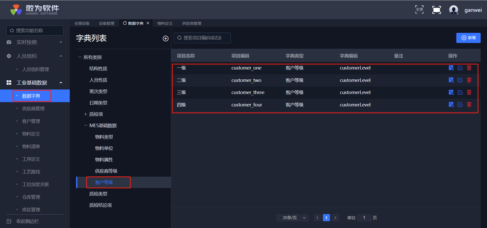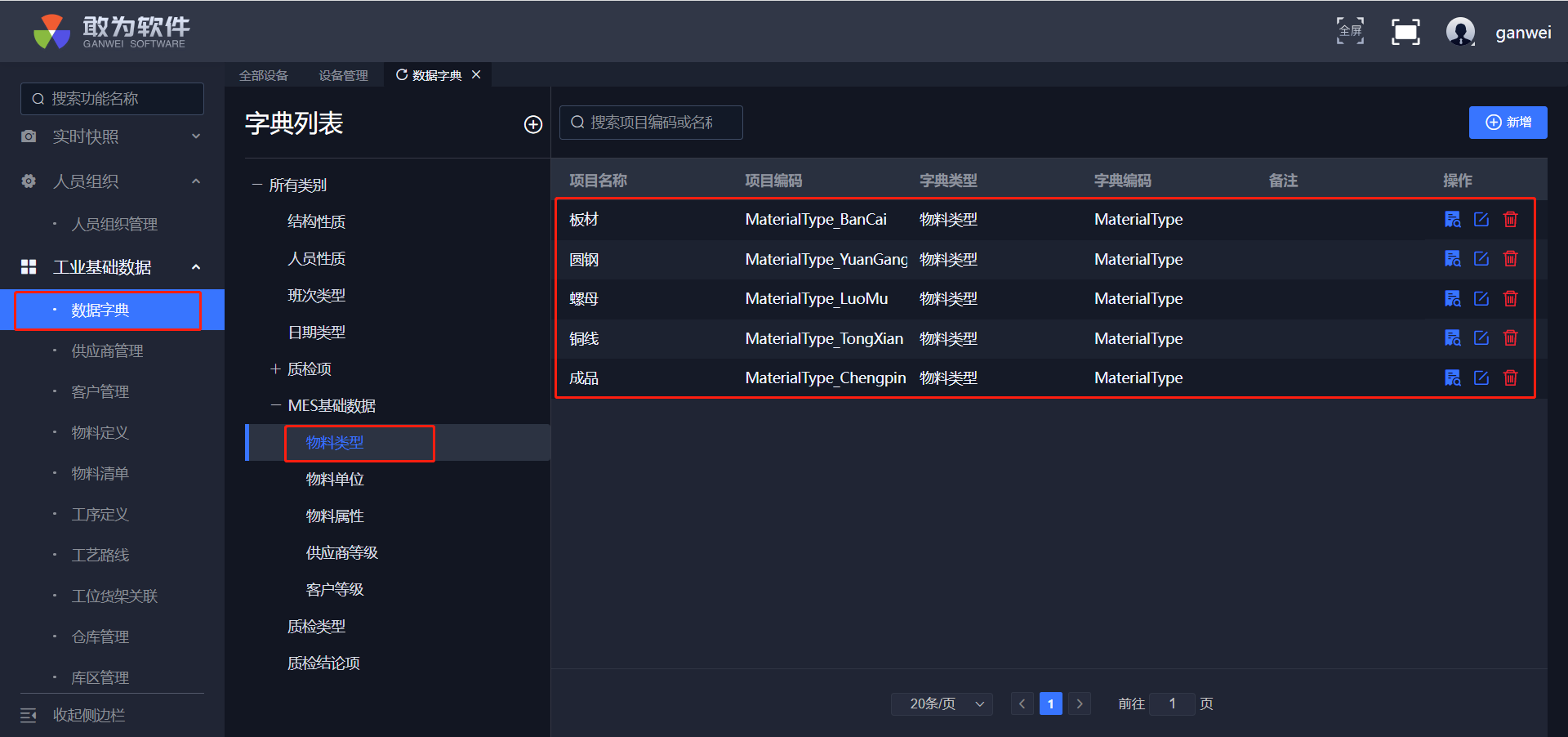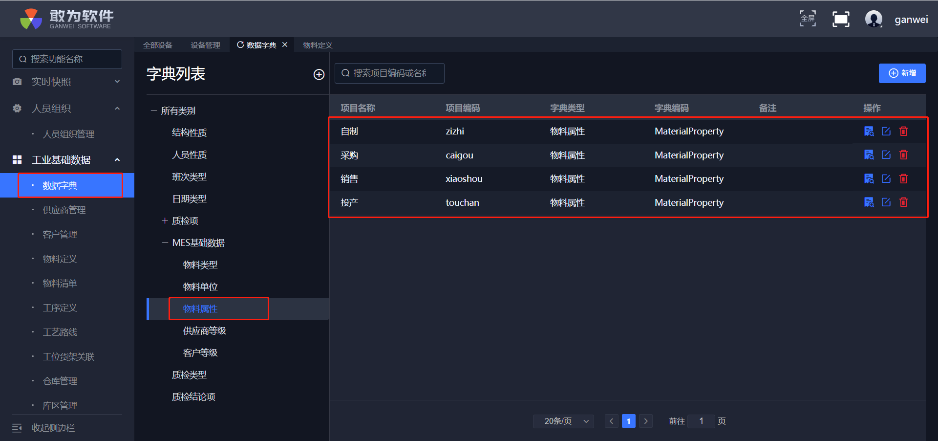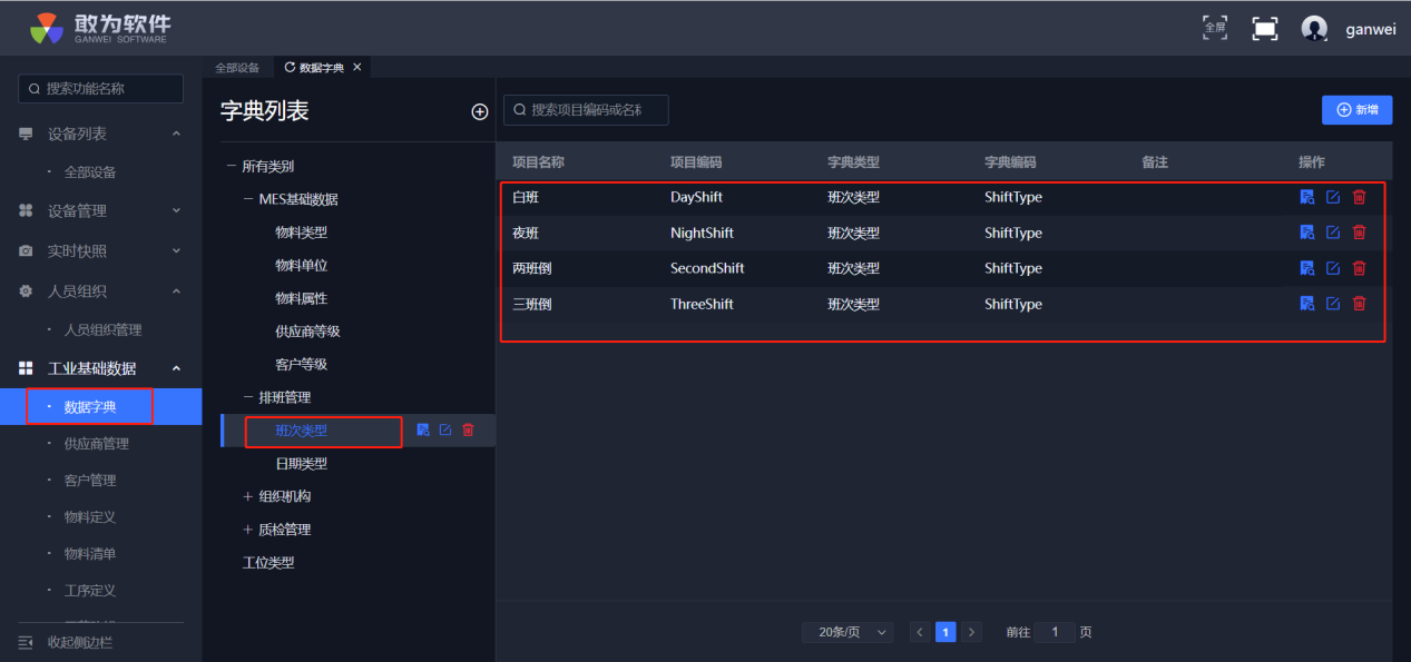 | 1 | 数据字典 | 支持物料类型、物料单位、物料属性、供应商等级、客户等级、班次类型、日期类型、质检项目、质检类型、质检结论项、机构类型、人员类型的自定义与维护。 |