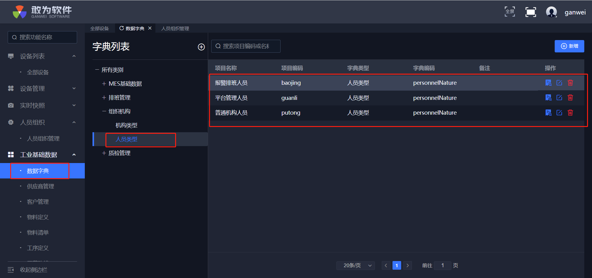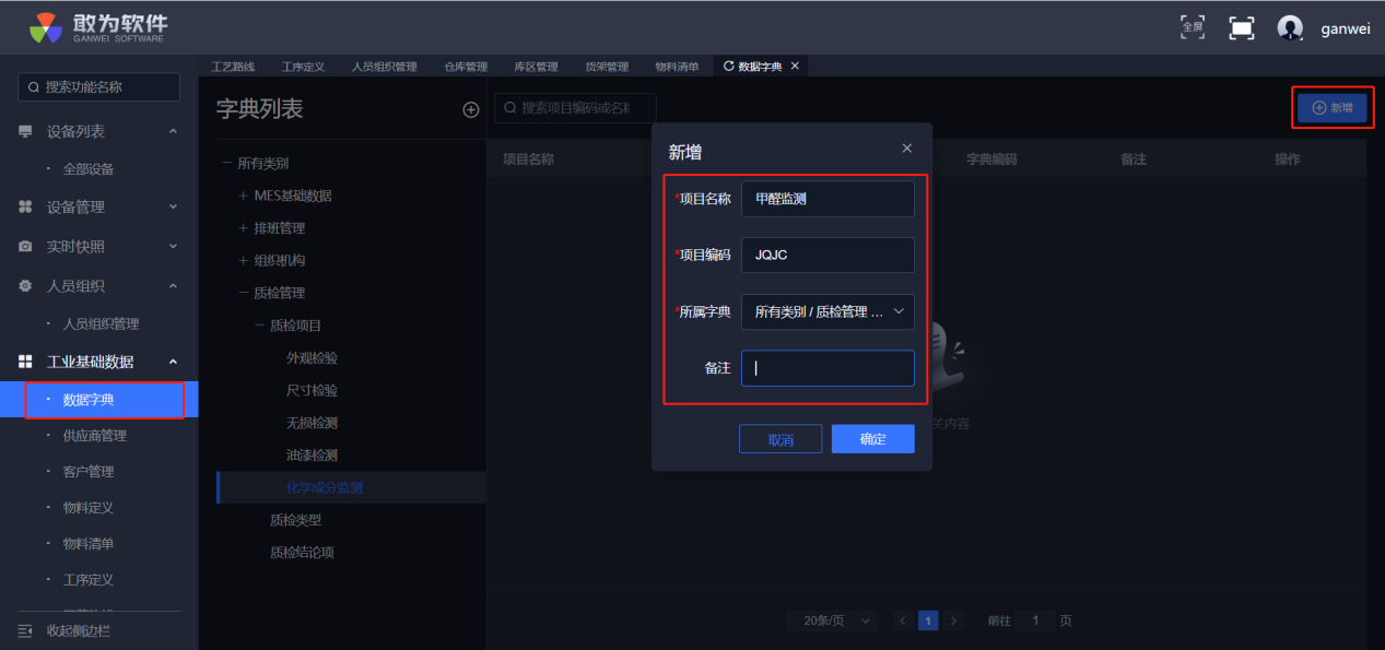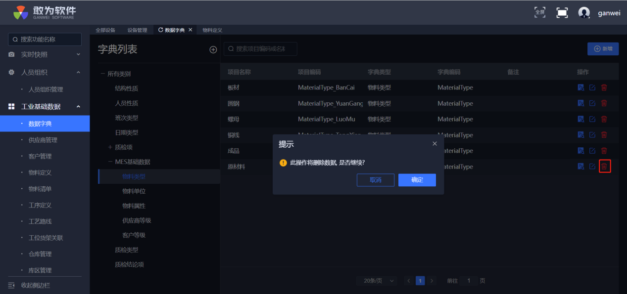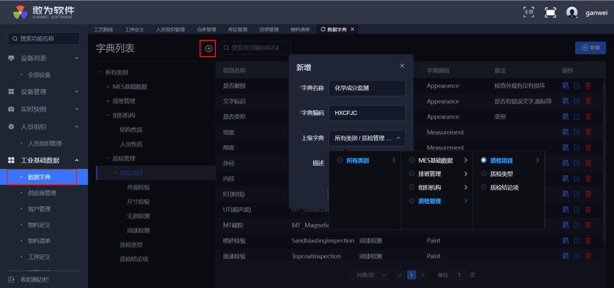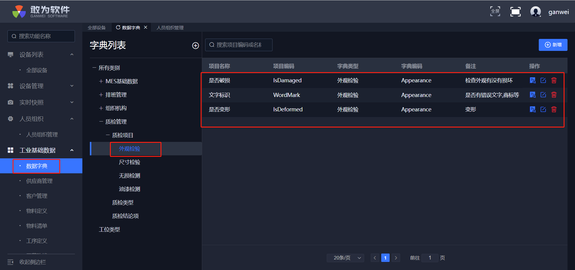 | 1 | 数据字典 | 支持物料类型、物料单位、物料属性、供应商等级、客户等级、班次类型、日期类型、质检项目、质检类型、质检结论项、机构类型、人员类型的自定义与维护。 |
