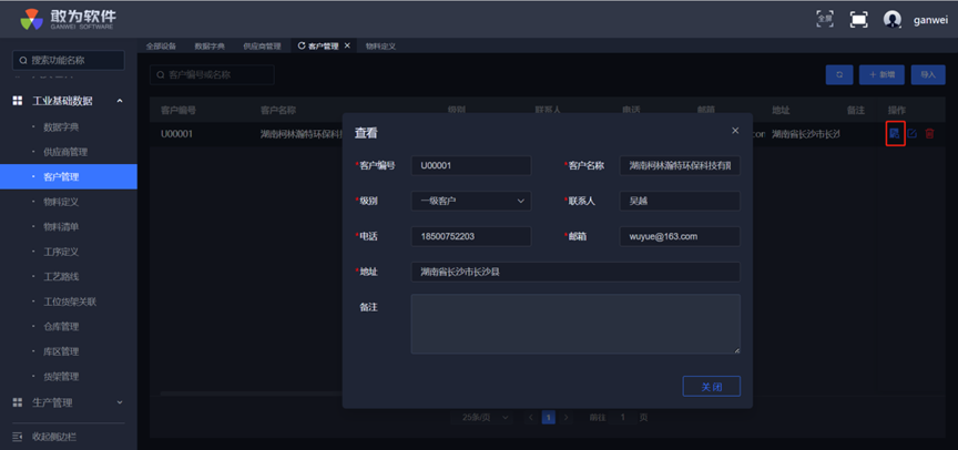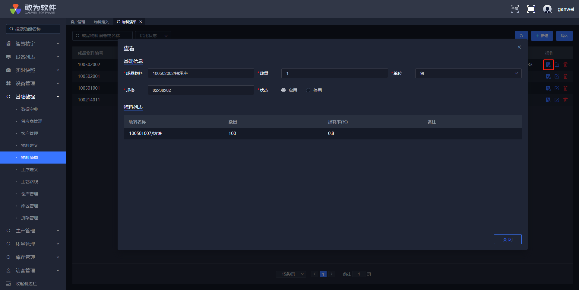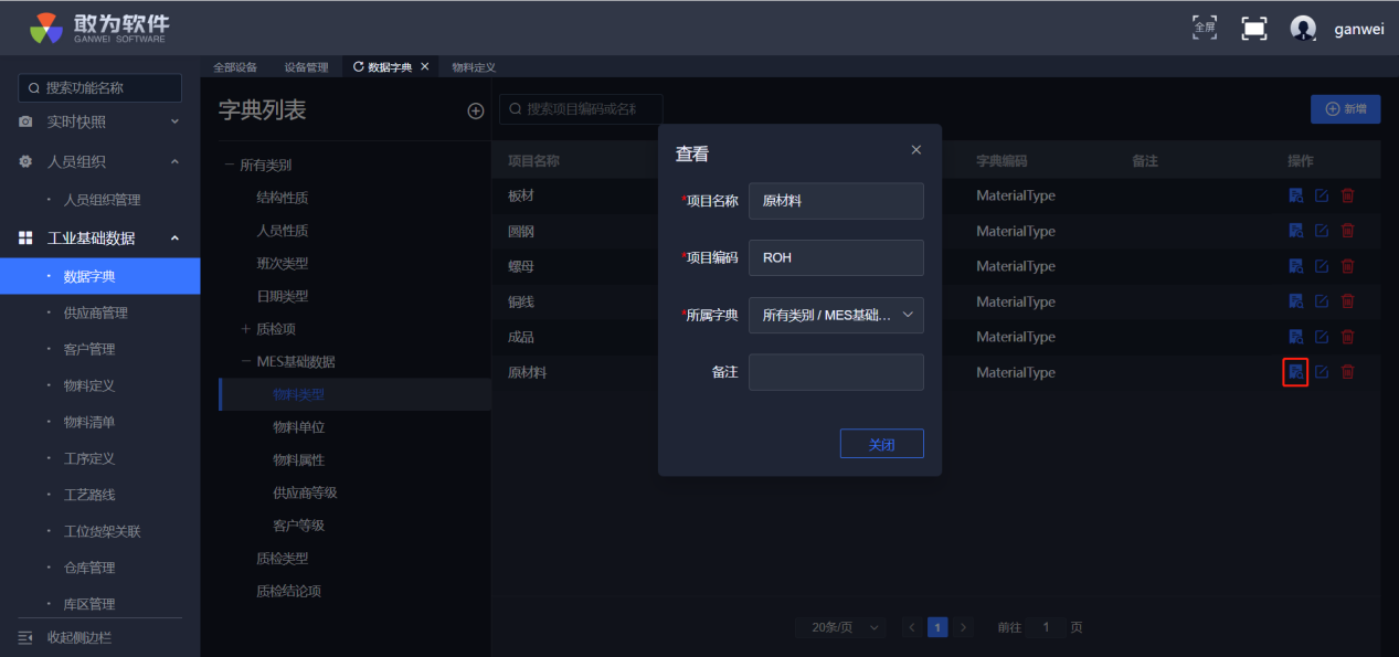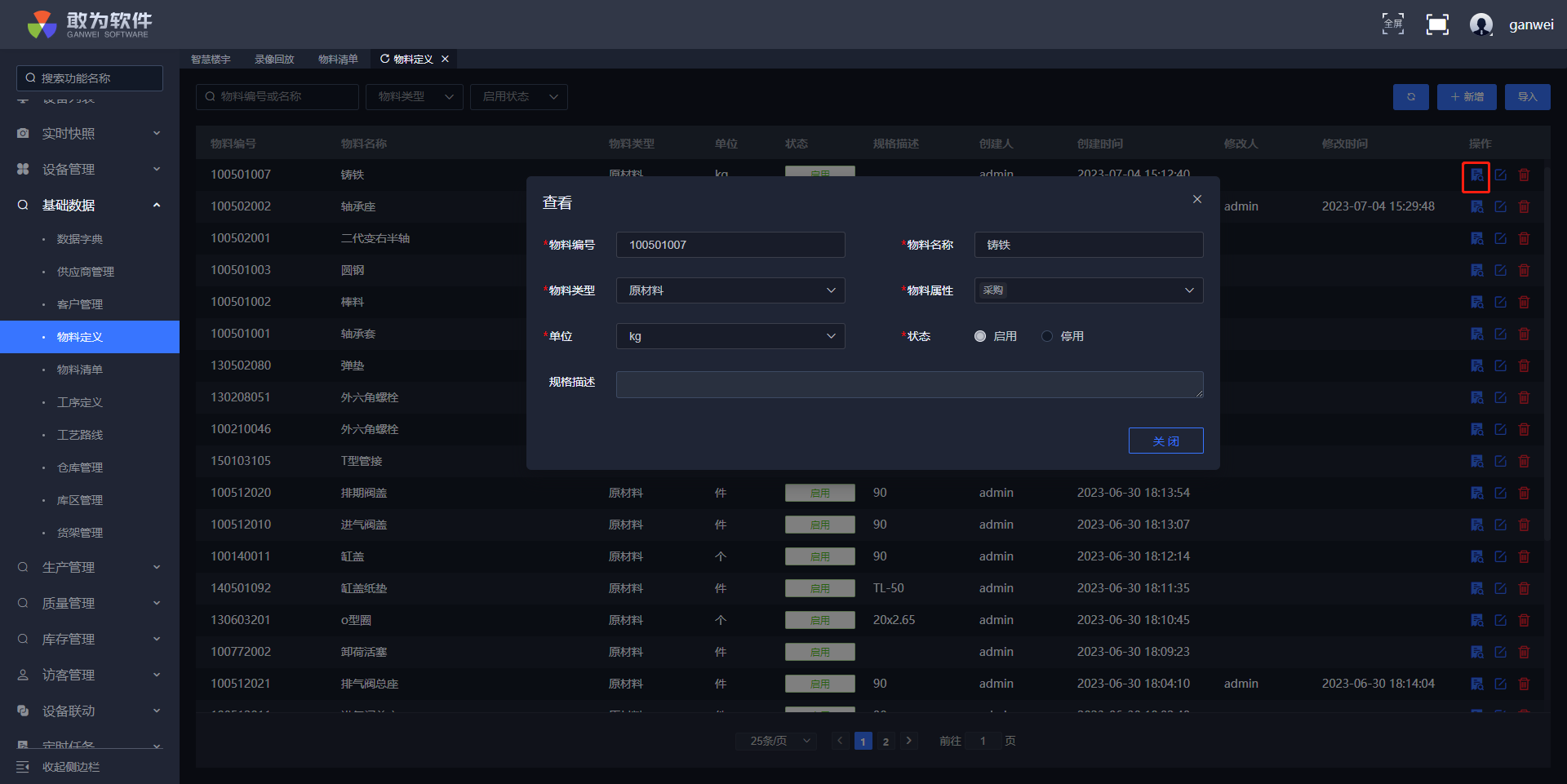 点击列表中的查看按钮,即可查看当前物料的详情数据。
