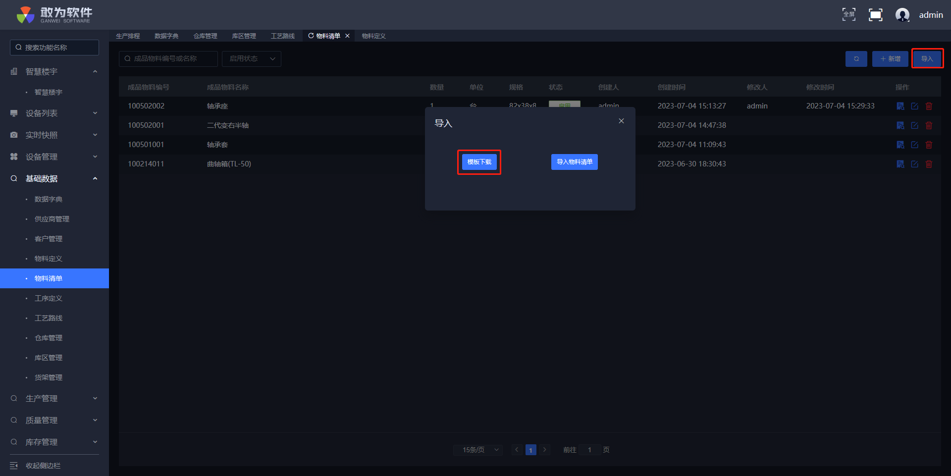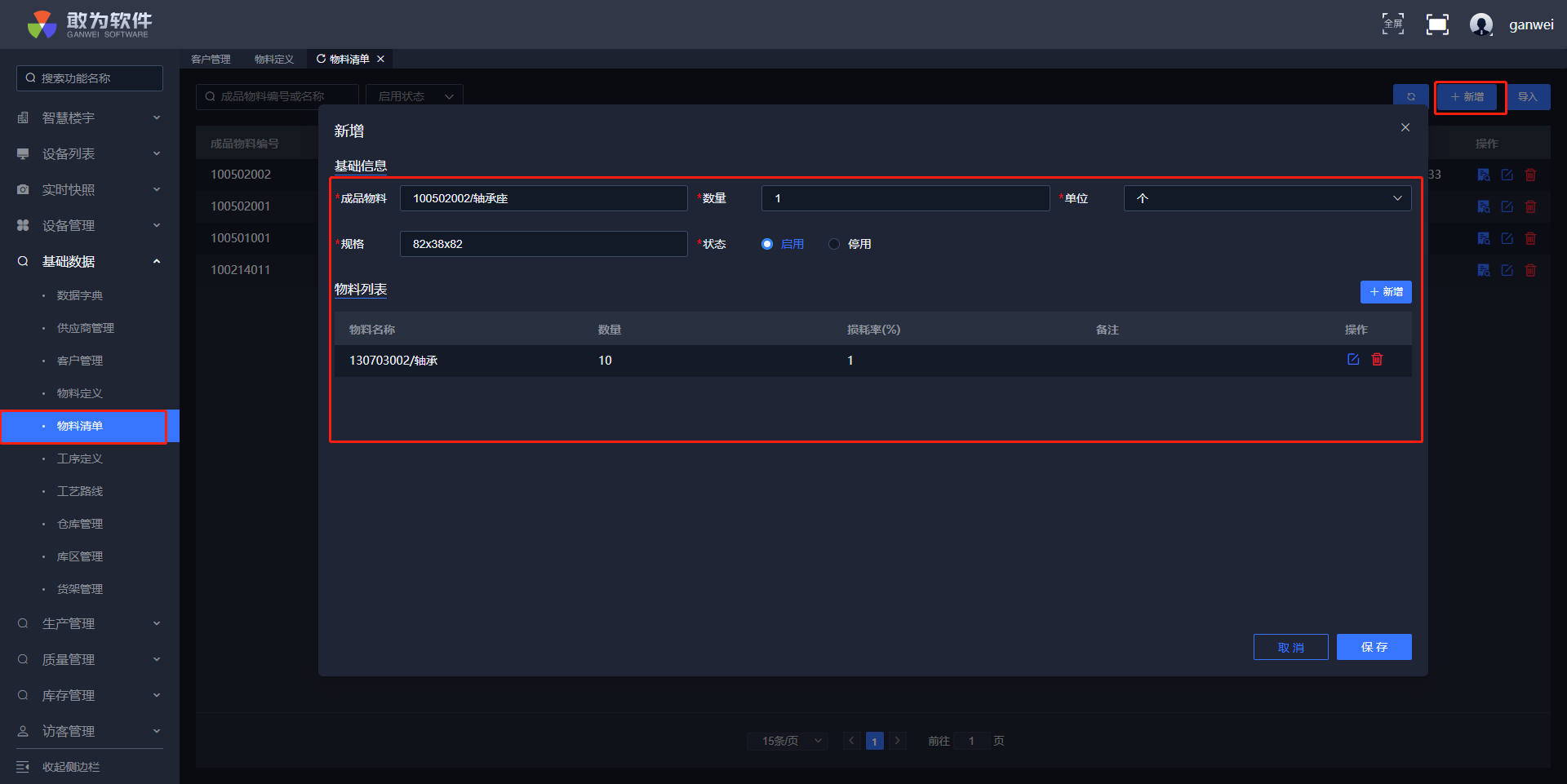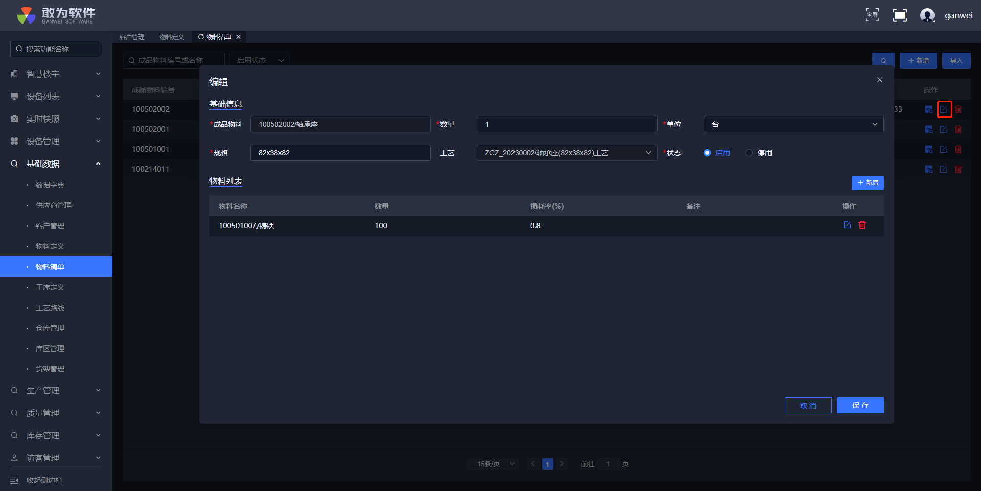点击列表中的修改按钮,在弹出页面修改物料清单信息,点击保存。